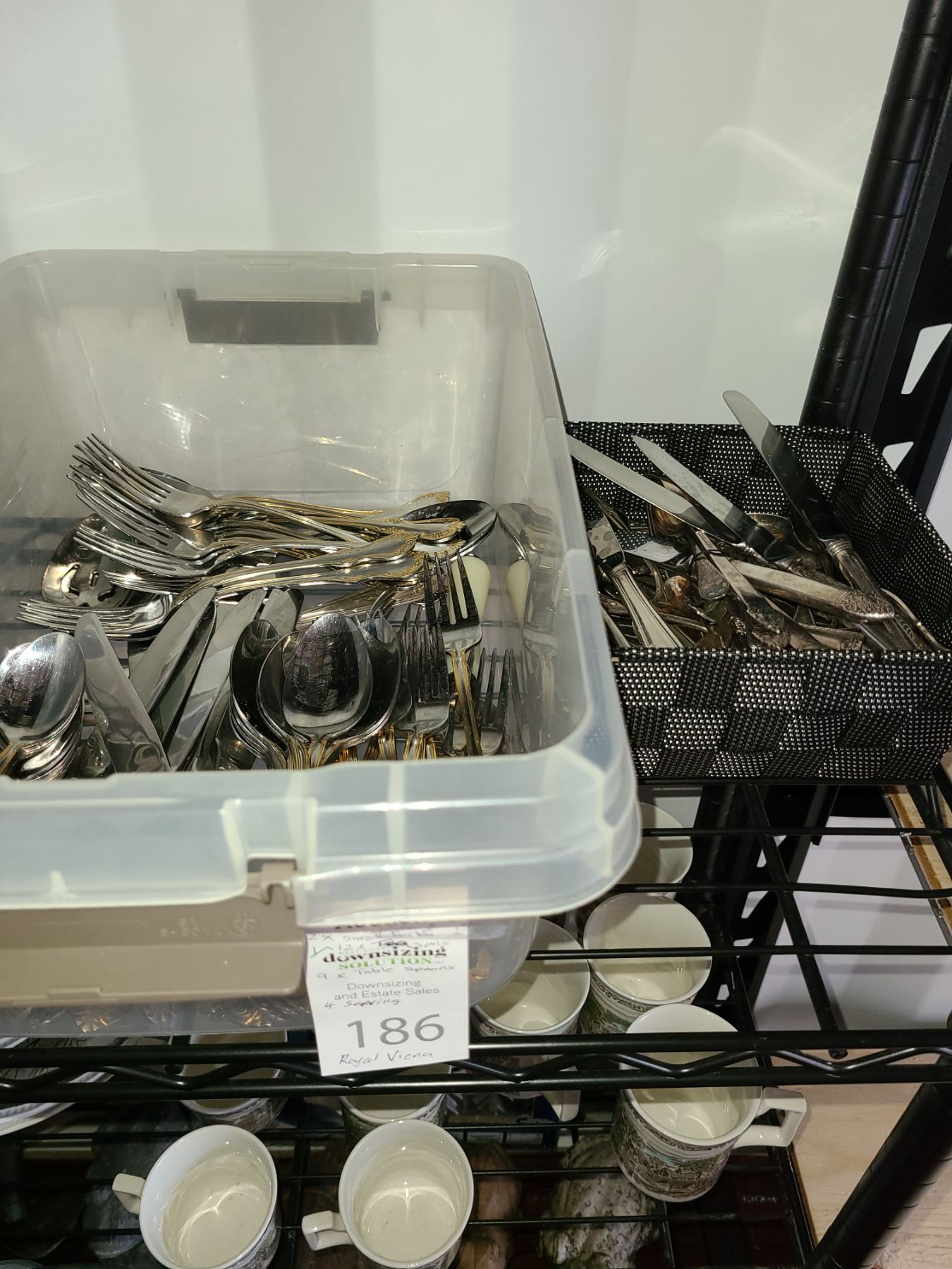 Royal Vienna flatware 12 x knives, 9 x Dinner forks, 12 x dessert forks, 12 x tea spoons and 4 serving pieces. An assortment of older flatware. Bring packing material and pick up at 10 am