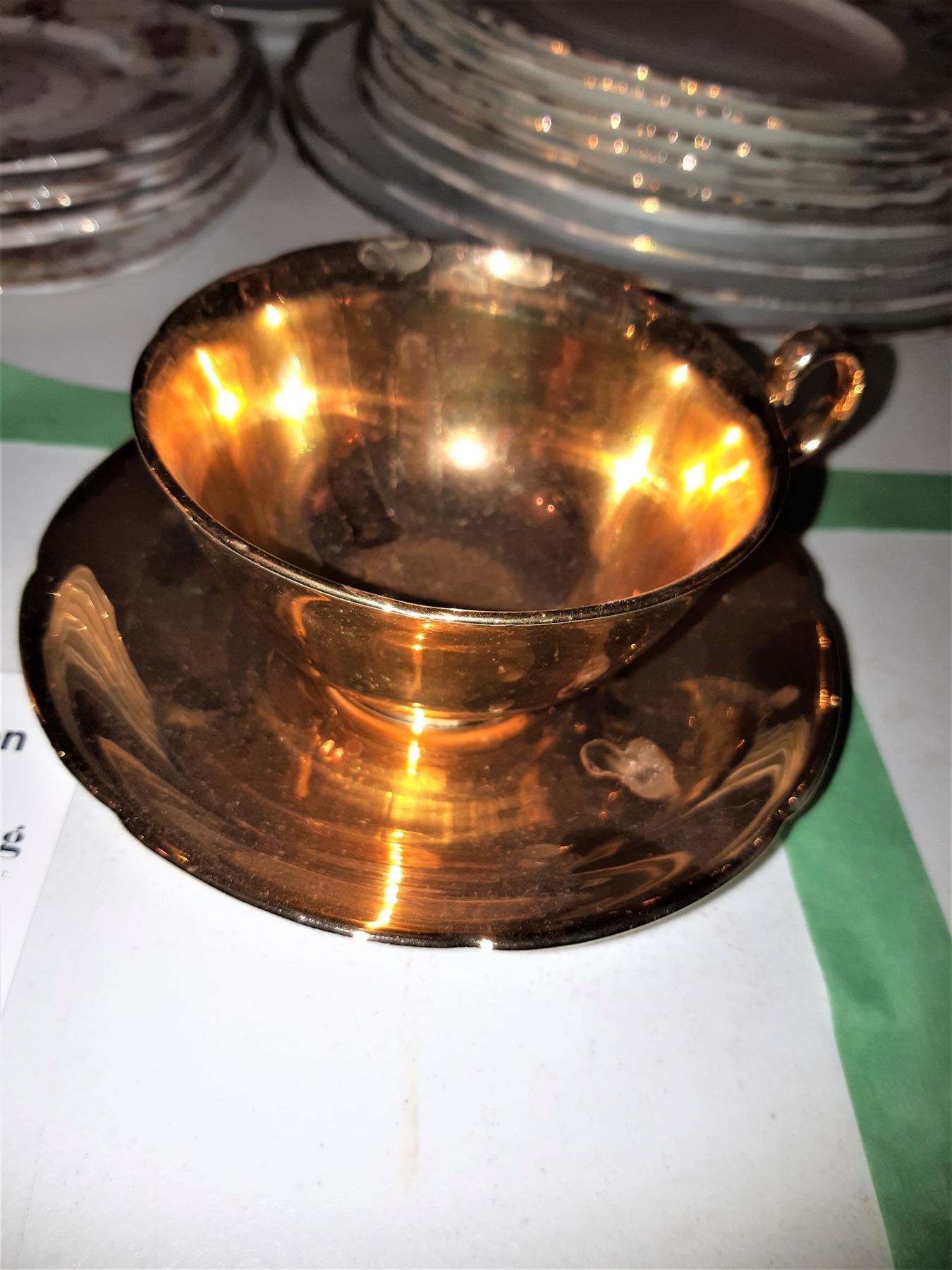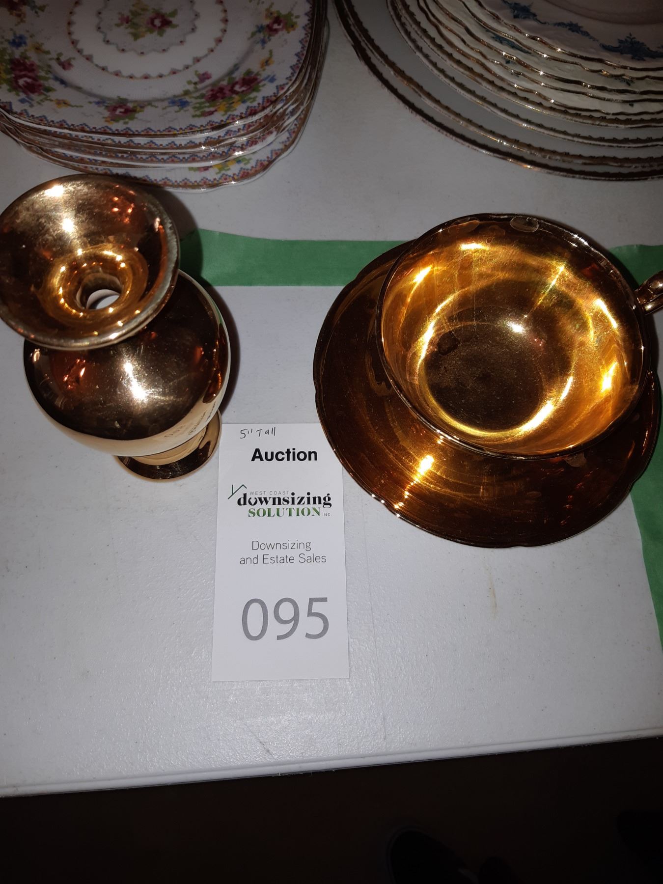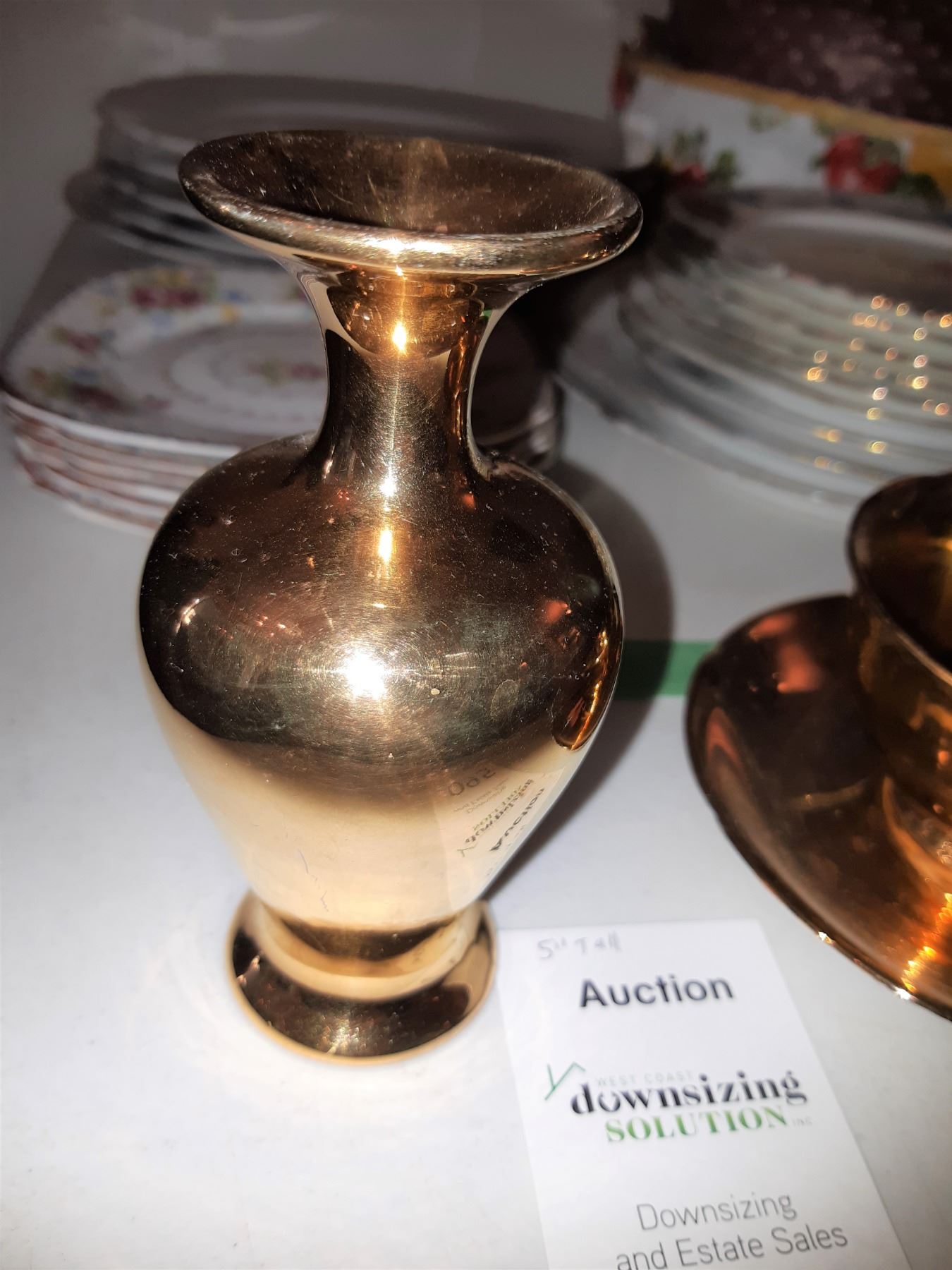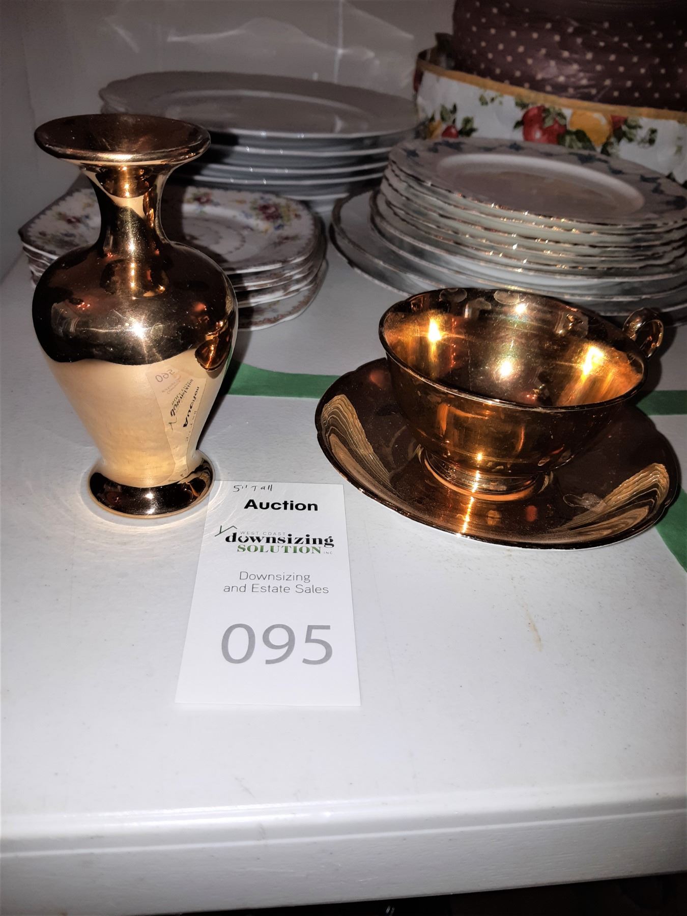 Cup, saucer and vase all gold painted. Vase is 5" high. Bring packing materials