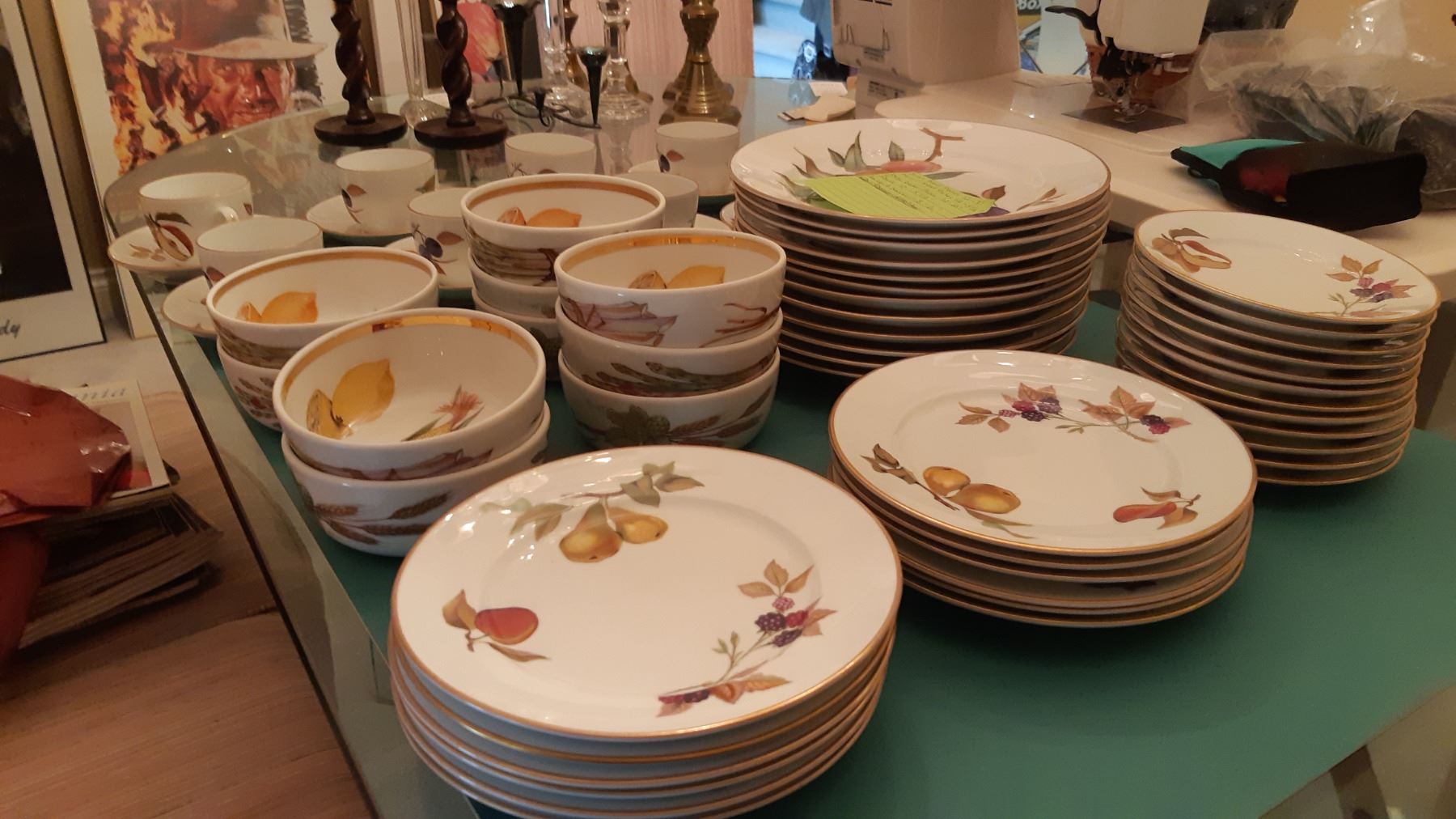 12 small plates (7"), 12 medium plates (8.5"), 12 dinner plates (10"), 10 bowls (5.5"), and 8 cups with saucers.