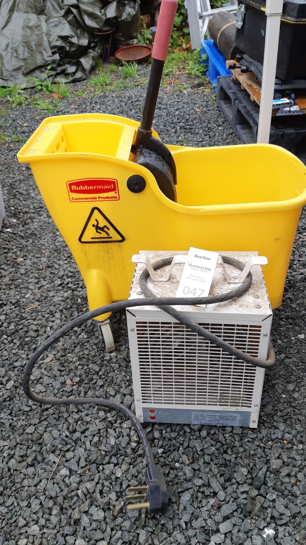 Rubbermaid Wheely mop bucket and Dimplex heater. Pickup at 11 am