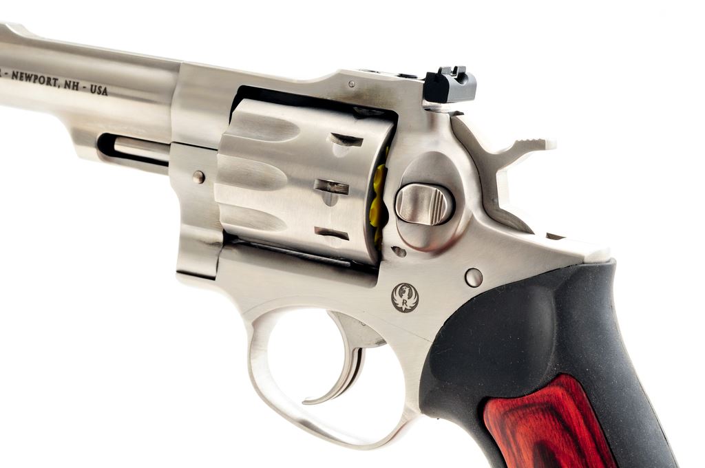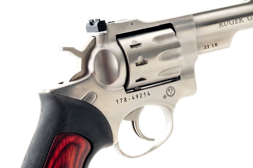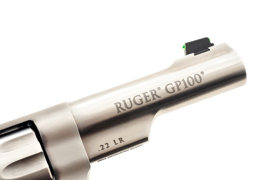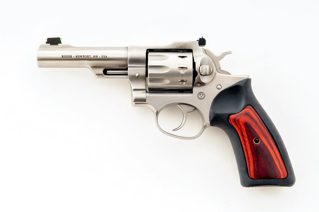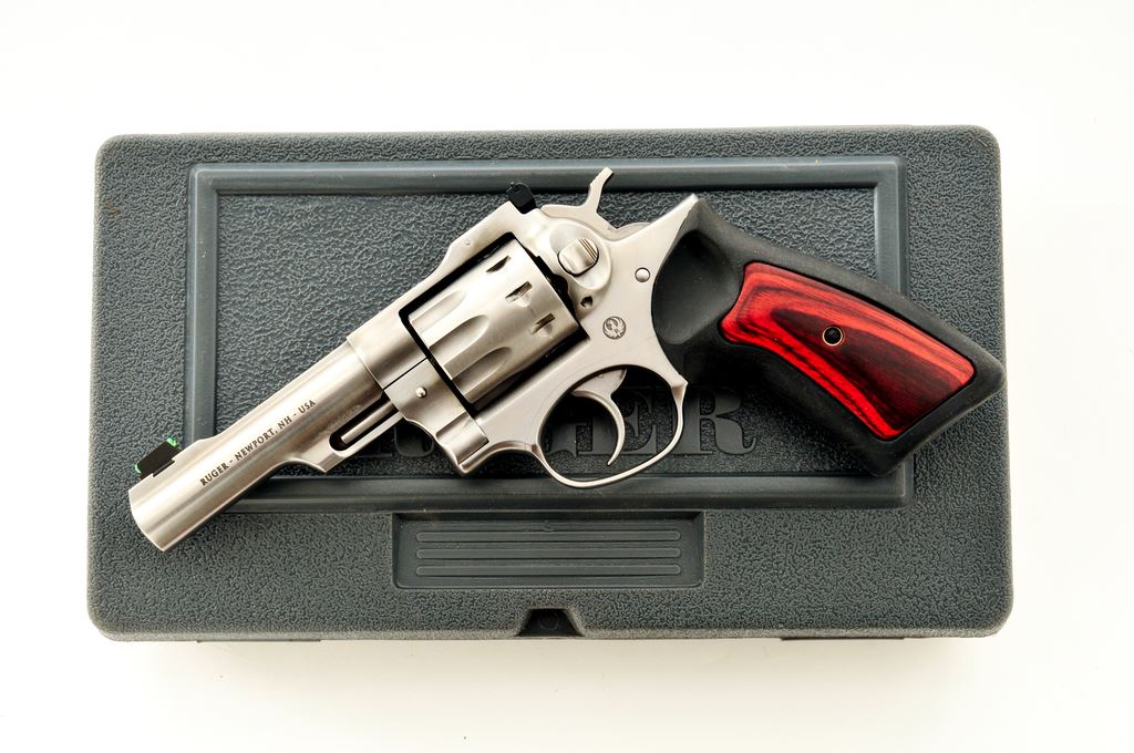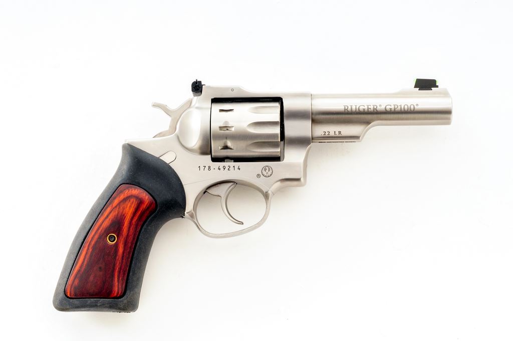 Ruger GP 100 Double Action Revolver, #178-49214, .22 LR cal., 10-shot, 4.25'' barrel, stainless steel, black rubber grips with wood inserts, green fiber optic front sight, and white-outline fully adjustable rear sight. In original plastic case with matching end label, owner's manual, and gun lock. Mfg's part #KGP-22-4. Metal surfaces show just normal signs of light use and are in excellent condition. Cylinder with a thin index line. Wood inlays on both grips appear near new; rubber shows overall scuffs and scratches; bottom edge with a larger smudge mark and appears as if the rubber got hot at some point. Action is smooth and crisp with a bright bore. Est.: $400-$600. (Modern) (Not available to Calif. residents.)
