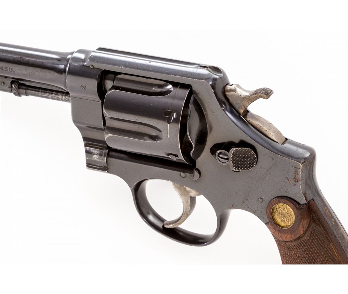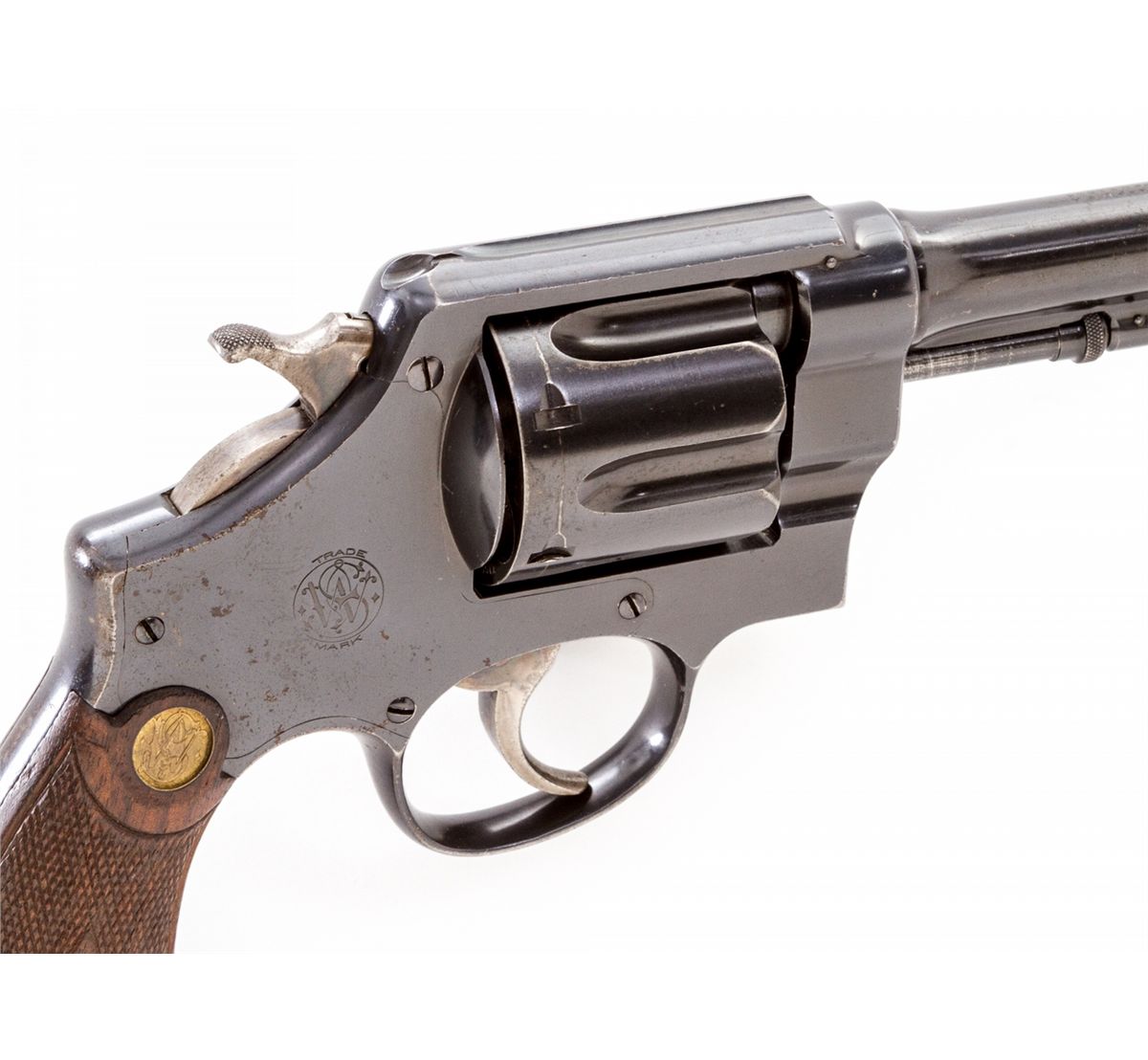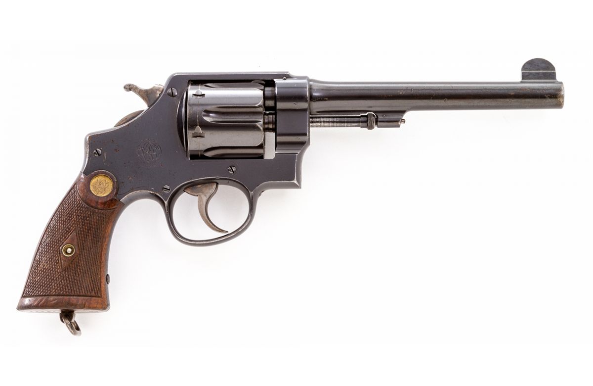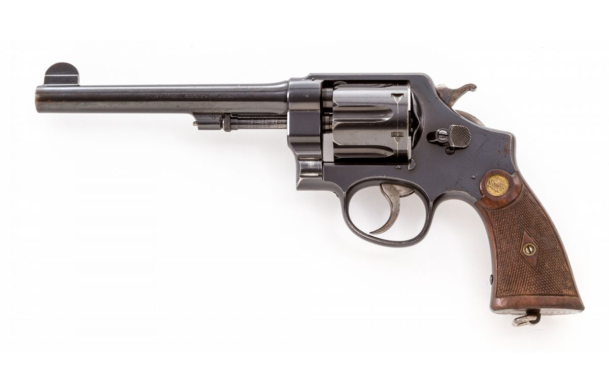 Smith & Wesson 2nd Model Hand Ejector Double Action Revolver, #71657, .455 cal., 6-1/2'' barrel, blue finish, factory large diamond checkered walnut grips with S&W gold medallions, lanyard loop in butt, and standard service sights. English proofed with crown-''30''. Condition is excellent retaining approx. 95% original factory blue with slight losses at muzzle and on forward edges, and minor toning in places. Thinning and toning to strap. Grips show minor flattening. Action is crisp, bore is mirror bright. Est.: $750-$1,000. (C&R)