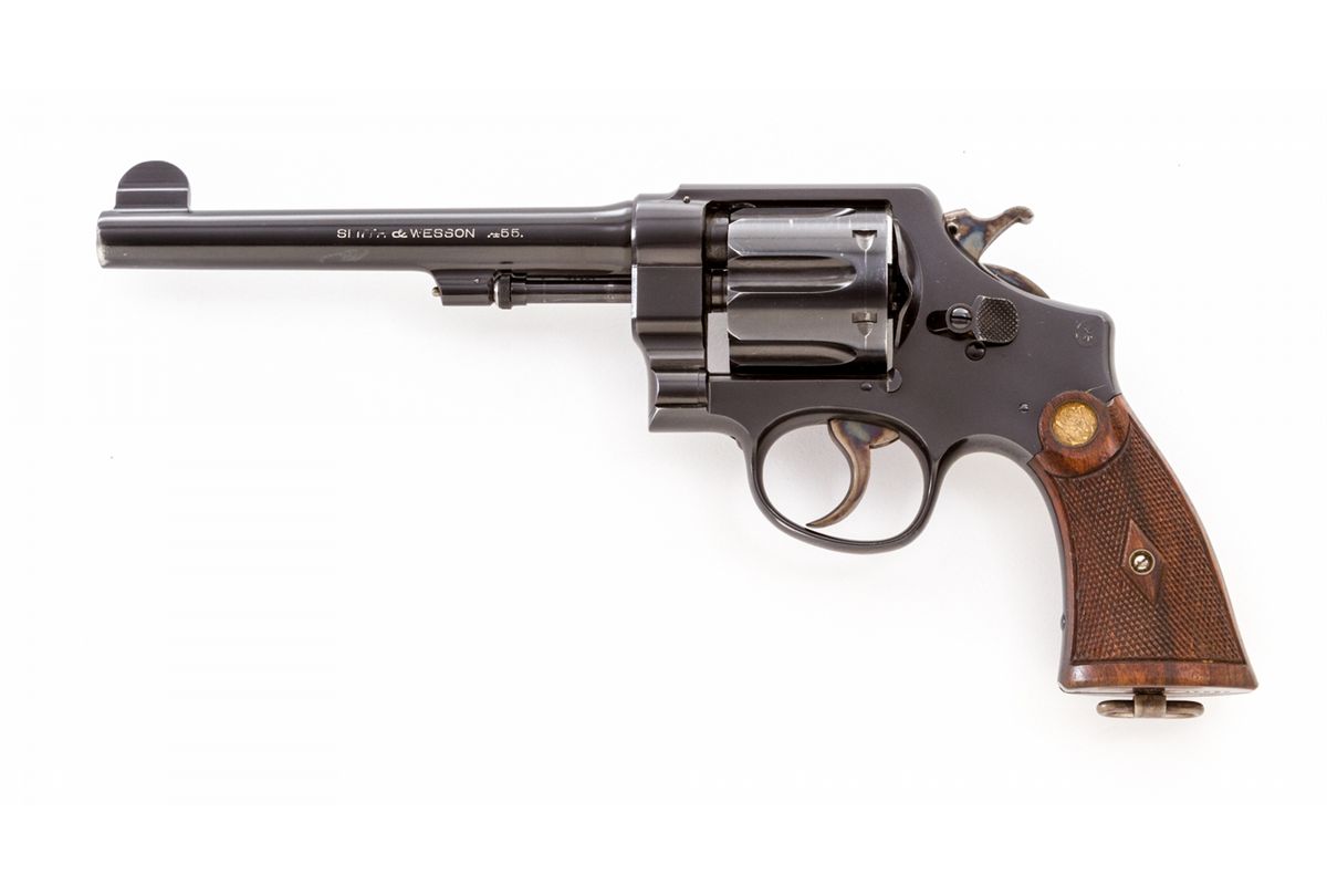 Smith & Wesson 2nd Model Hand Ejector Double Action Revolver, #36547, .455 cal., 6-1/2'' barrel, blue finish, factory large diamond checkered walnut grips with S&W gold medallions, lanyard loop in butt, and standard service sights. Broadarrow ''C'' Canadian proofmarks to rear portion left side of frame; crown-''O'' proofmarks on butt. Condition is excellent retaining approx. 97% original factory blue with slight losses at muzzle and on forward edges. Grip straps and butt are strong, as is triggerguard, with only slight traces of dragline to cylinder. Grips show minor flattening. Action is crisp, bore is bright. Est.: $1,200-$1,800. (C&R)