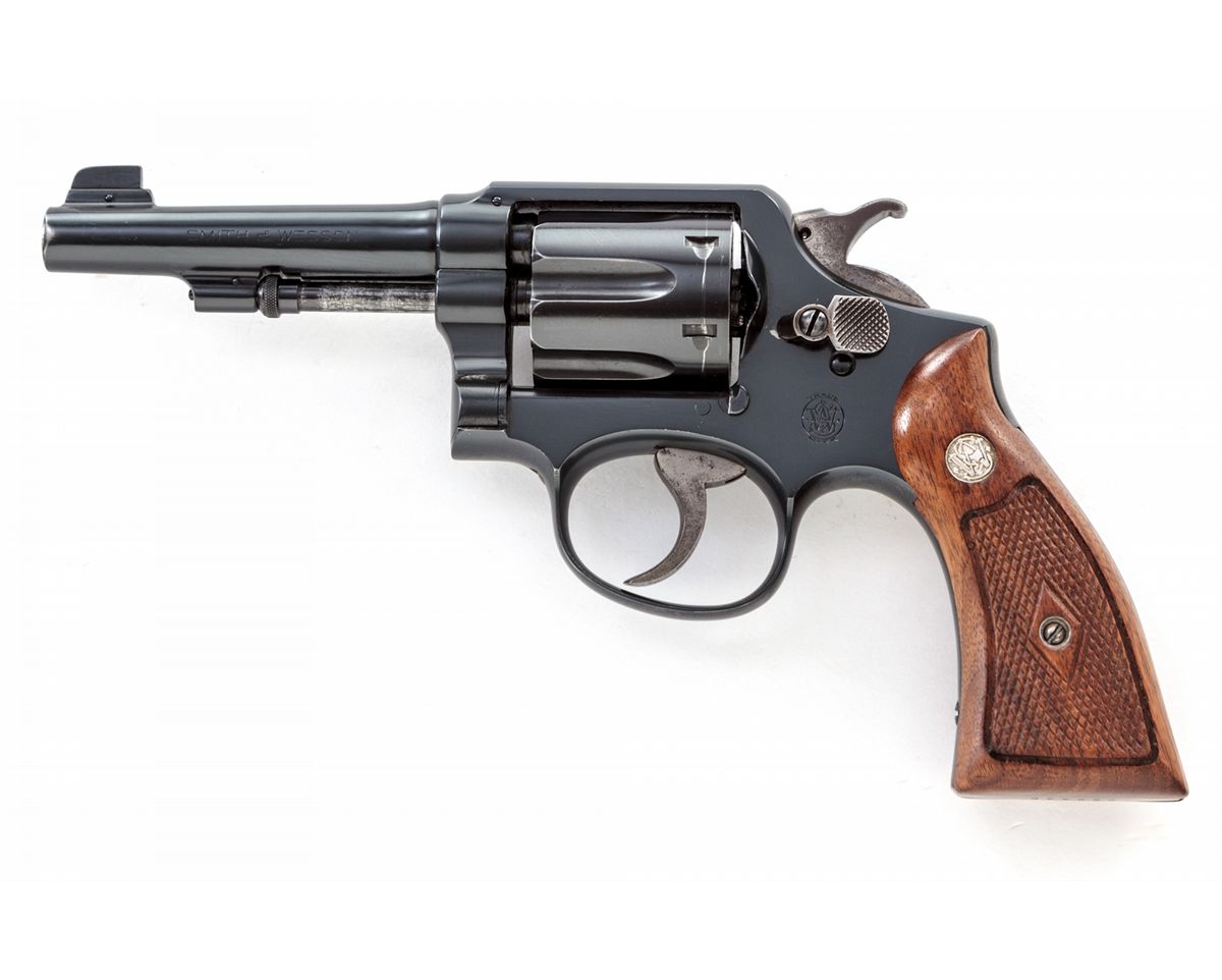 Special Dept. of Correction Smith & Wesson M&P Double Action Revolver, #566445, .38 Spec. cal., 4'' barrel, blue finish, early type pre-war hammer, Patridge type front sight and backstrap marked ''Department of Correction'', factory checkered diamond walnut grips with S&W medallions. Condition is excellent showing thinning in actioning areas of ejector rod, at muzzle, and forward edges of cylinder. Crisp grips and action, mirror bright bore. Est.: $500-$750. (Modern)