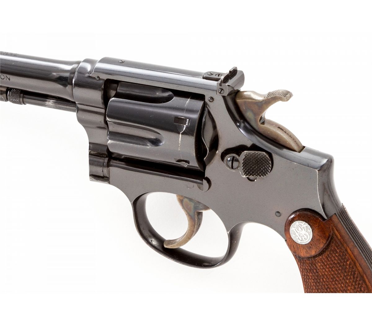 Smith & Wesson K22 1st Model Outdoorsman Double Action Revolver, #676612, .22 LR cal., 6'' barrel, blue finish, factory checkered large diamond walnut grips with bright S&W medallions. Pre-war adjustable rear sight and gold bead Patridge type front sight. Mfg'd between 1931-1940. Condition is excellent with light thinning at muzzle and forward edges of cylinder with visible index mark. Grips and action are crisp, bore is bright. Est.: $1,000-$1,500. (C&R)