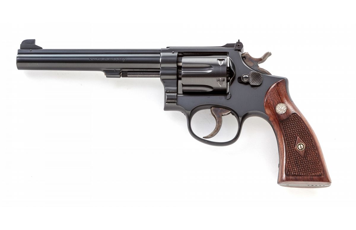 Smith & Wesson K38 Double Action Revolver, #K78629, .38 Spec. cal., 6'' barrel, blue finish, early diamond checkered walnut grips with S&W medallions. Adjustable rear and Patridge front sights. Condition is excellent showing just light marks from handling. Est.: $600-$800. (Modern)