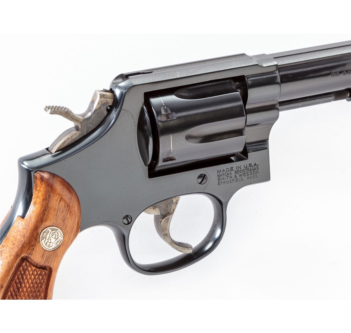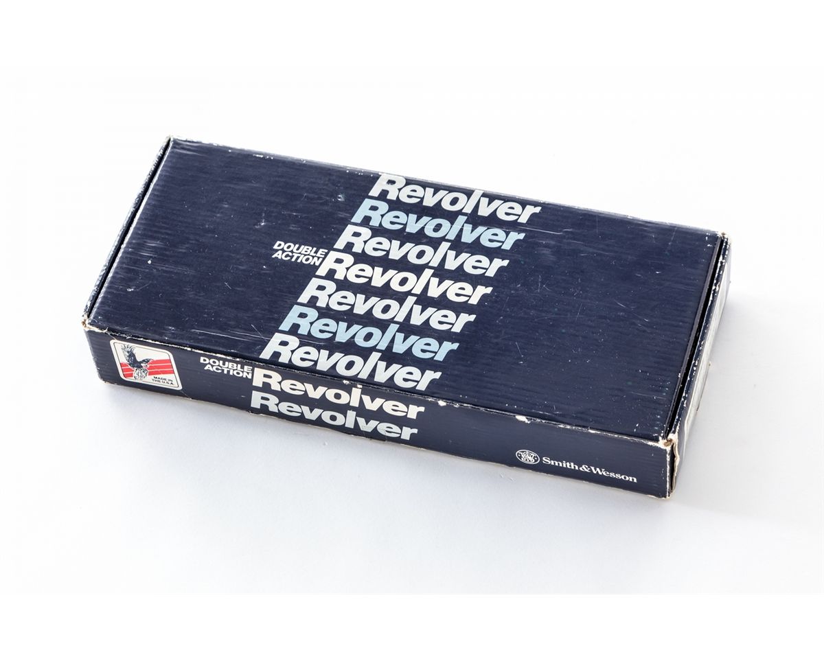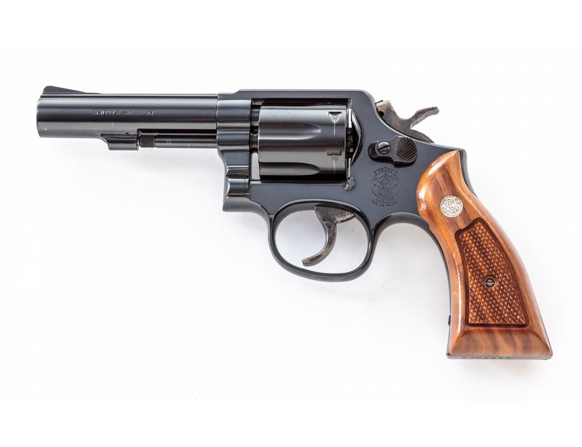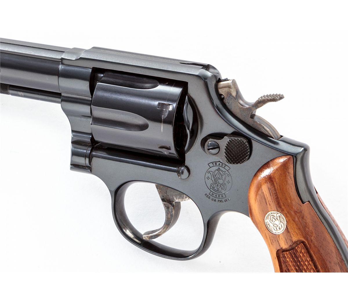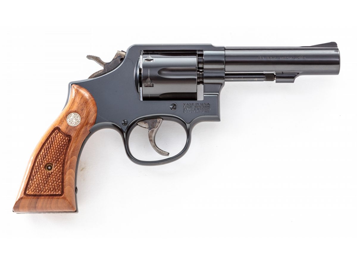Smith & Wesson Model 10-10 Double Action Revolver, ##BJH6880, .38 Spec. cal., 4'' bull barrel, blue finish, factory checkered S&W wood grips with medallions. Condition is excellent, appearing as new, in original box. Est.: $500-$750. (Modern)