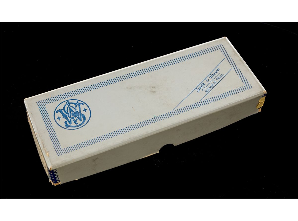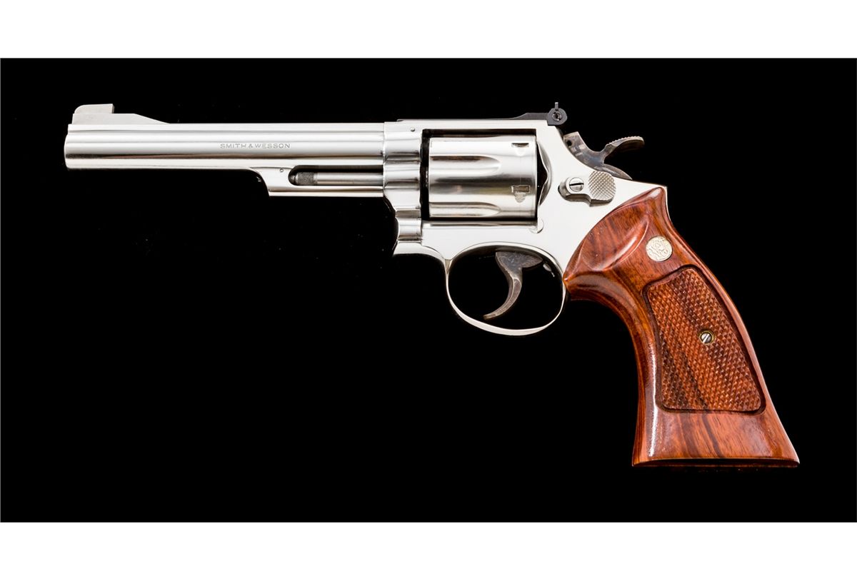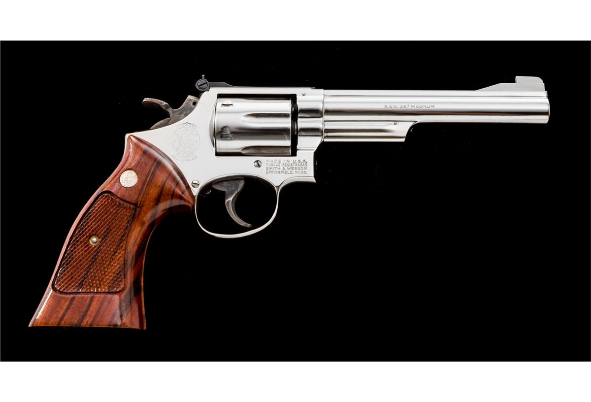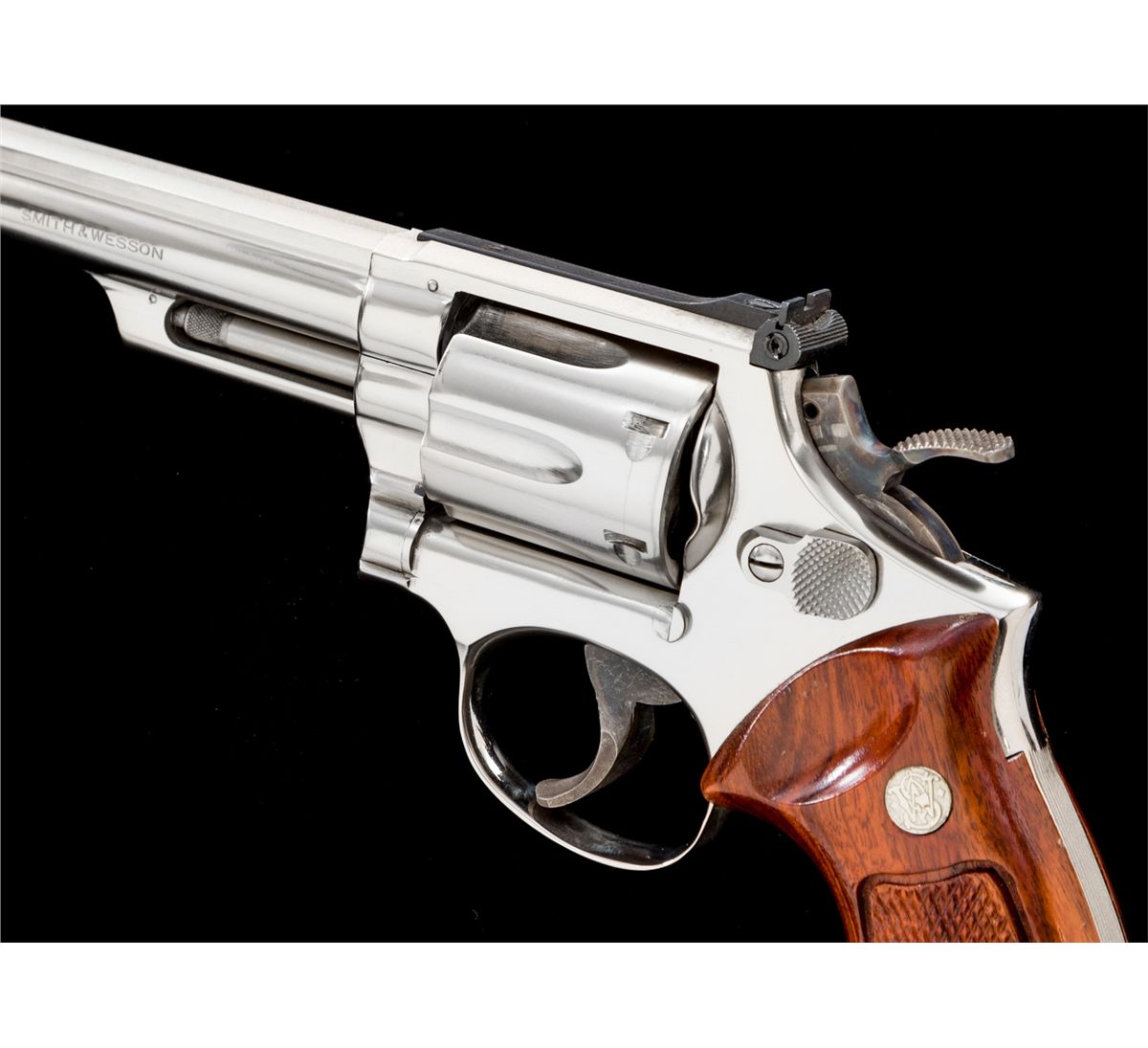 Smith & Wesson Model 19-3 Double Action Revolver, #7K24949, .357 mag. cal., 6'' pre-1981 pinned barrel, nickel finish, factory checkered target grips with S&W medallions, in original gray box connotating nickel finish, with warranty card and cleaning kit. Target trigger, target hammer, Patridge front sight, and micro-click adjustable rear sight. Condition is excellent showing very little use. Exterior of box with minor soiling. Est.: $650-$900. (Modern)