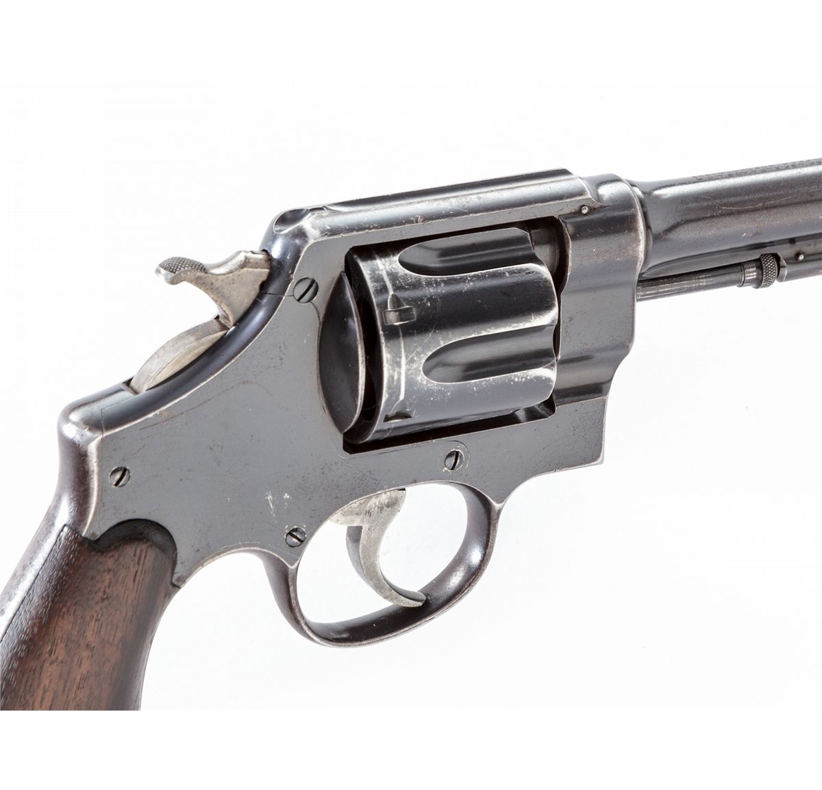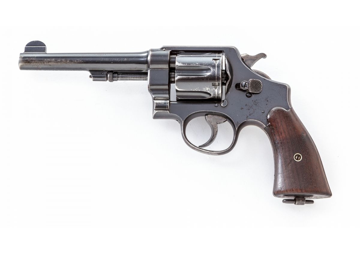 U.S. Model 1917 Double Action Revolver, by Smith & Wesson, #51425, butt marked #86708, .45 ACP cal., 5-1/2'' barrel, blue finish, factory smooth walnut grips with lanyard loop in butt. Condition is fine retaining approx. 92% original blue with most of the thinning near muzzle and at topstrap, as well as high edges of cylinder. Grips with oil darkening and small scuffs. Action is good, bore is bright. Est.: $750-$1,000. (C&R)
