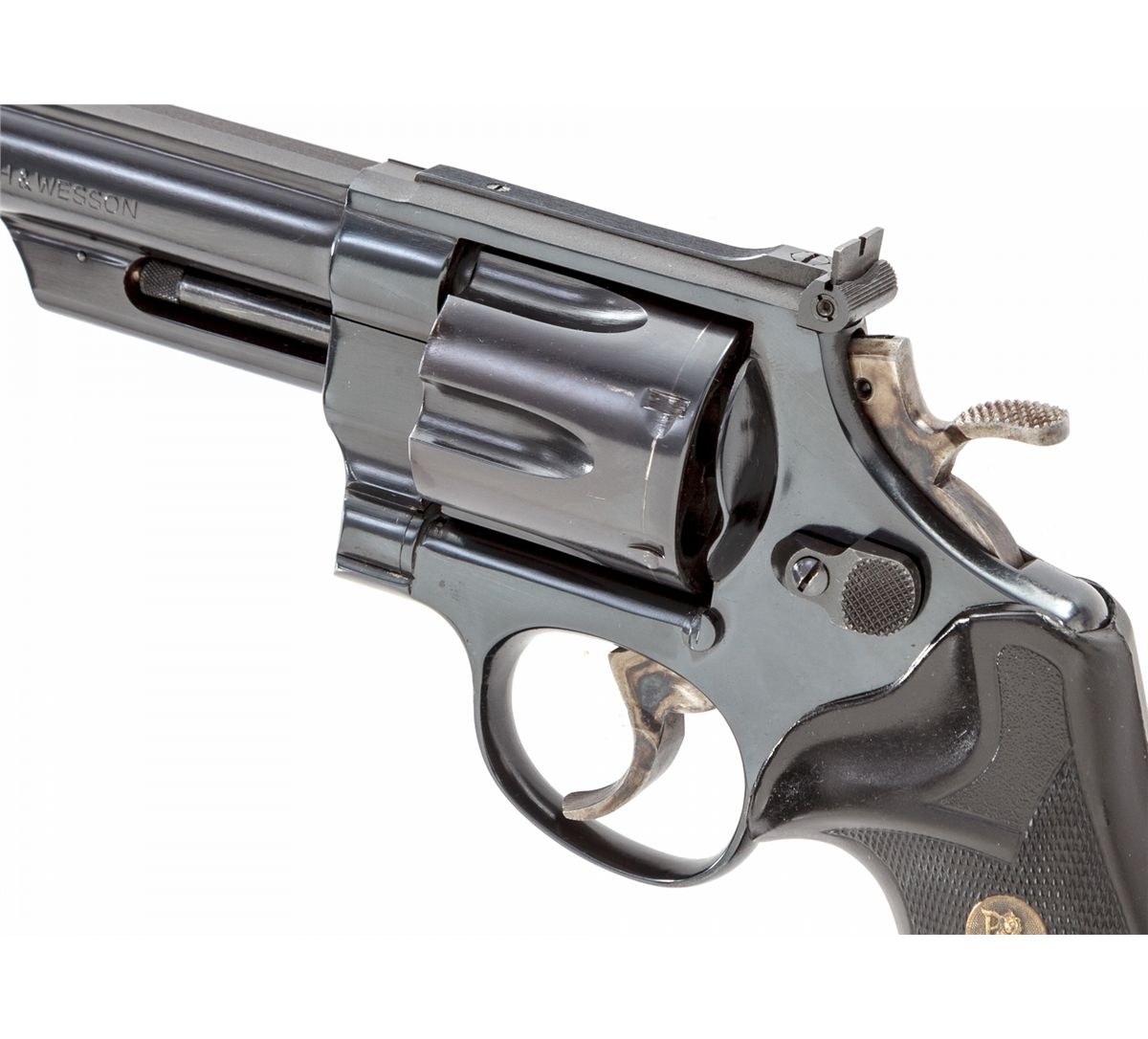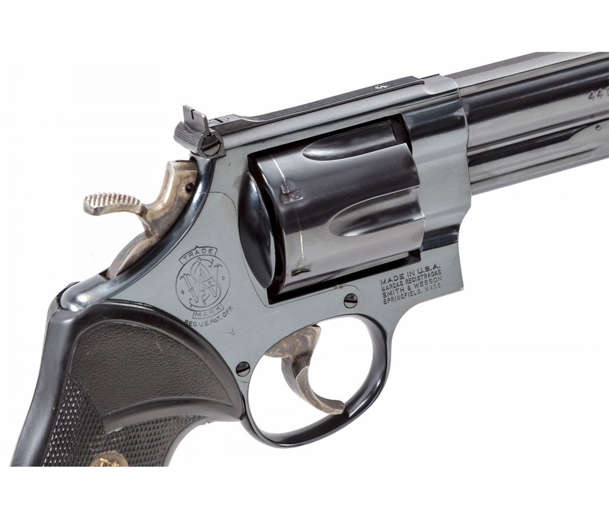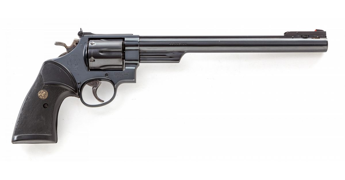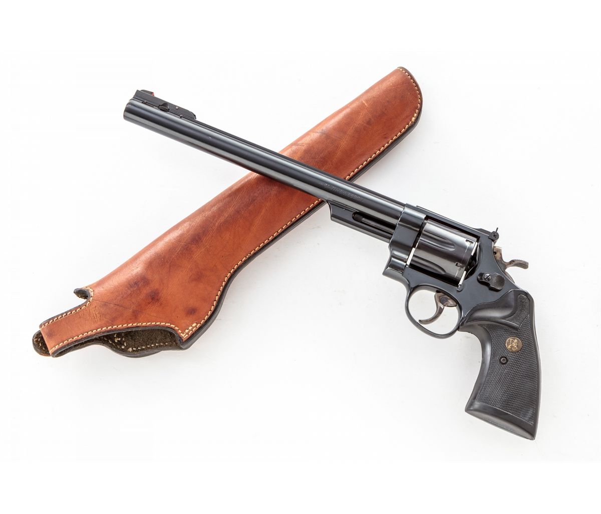 Smith & Wesson Model 29-3 Double Action Revolver, #AAM5371, .44 mag. cal., 10-5/8'' barrel, blue finish, Pachmayr black rubber grips, with red ramp four-position front sight. Barrel has been magna-ported. In brown leather holster. Condition is excellent with just light marks from handling. Seldom seen and highly desirable. Est.: $1,000-$1,500. (Modern)