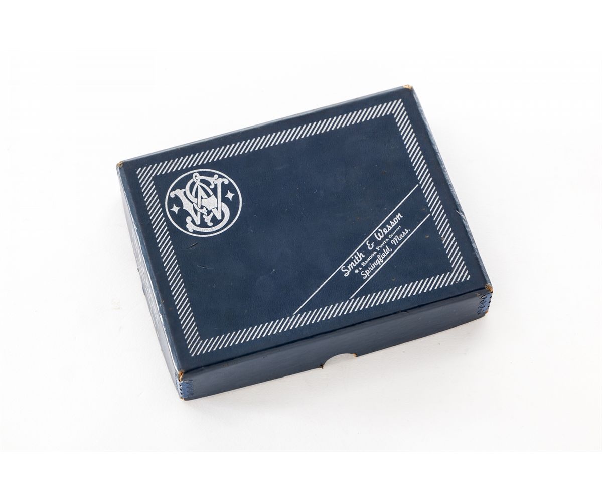 Smith & Wesson Model 39-2 Semi-Automatic Pistol, #A585719, 9mm, 4'' barrel, blue finish, factory checkered walnut grips, in original box with two factory and two Pro-Mag magazines. Condition is excellent, appearing as new and unfired. Est.: $500-$750. (Modern)