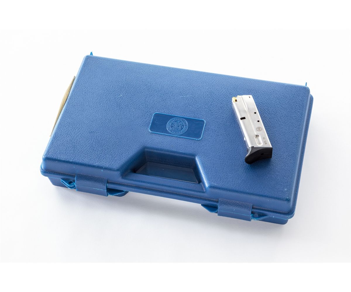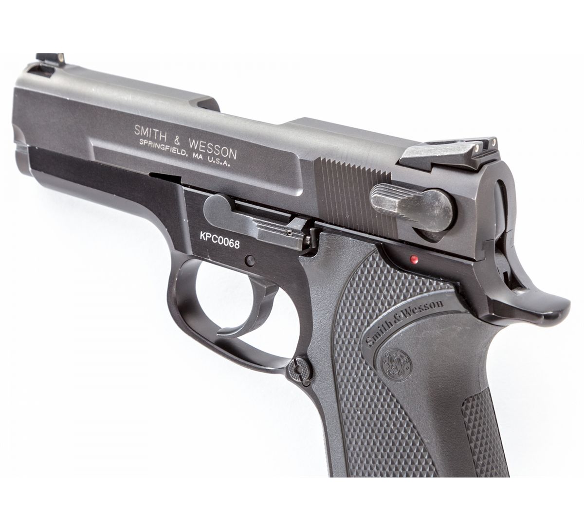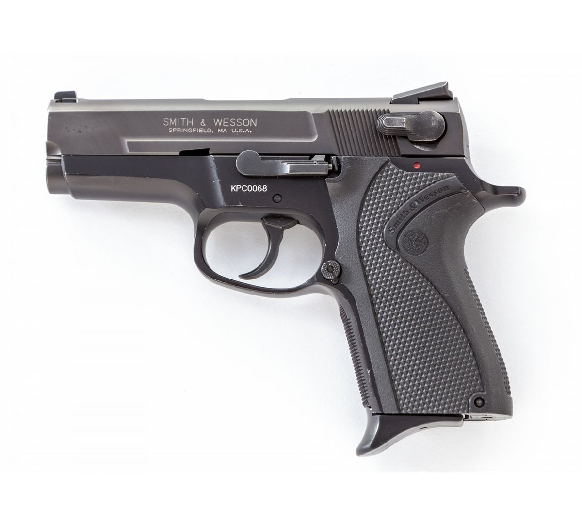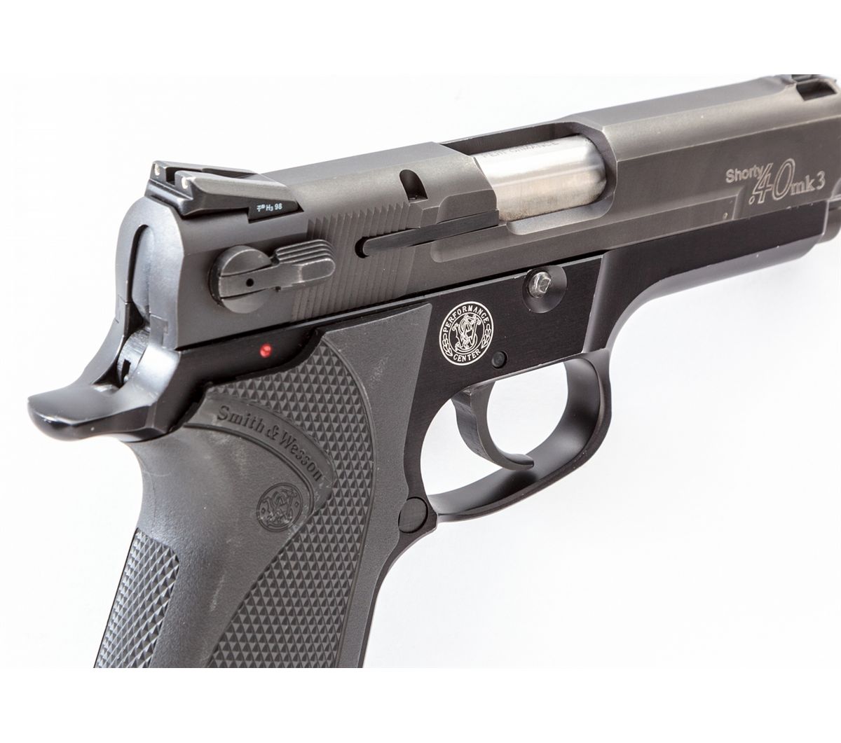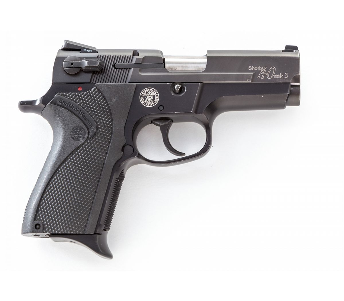 Smith & Wesson Performance Center Model 4006 ''Shorty Forty'' Semi-Automatic Pistol, #KPC0068, .40 S&W cal., 3-1/2'' barrel, blue finish, black checkered plastic grips, with two magazines and Novac style Trijicon sights. Considered quite scarce with all serial numbers observed under 200. Condition is near excellent showing just light range use, with minor thinning near muzzle from holster wear. Est.: $750-$1,000. (Modern)