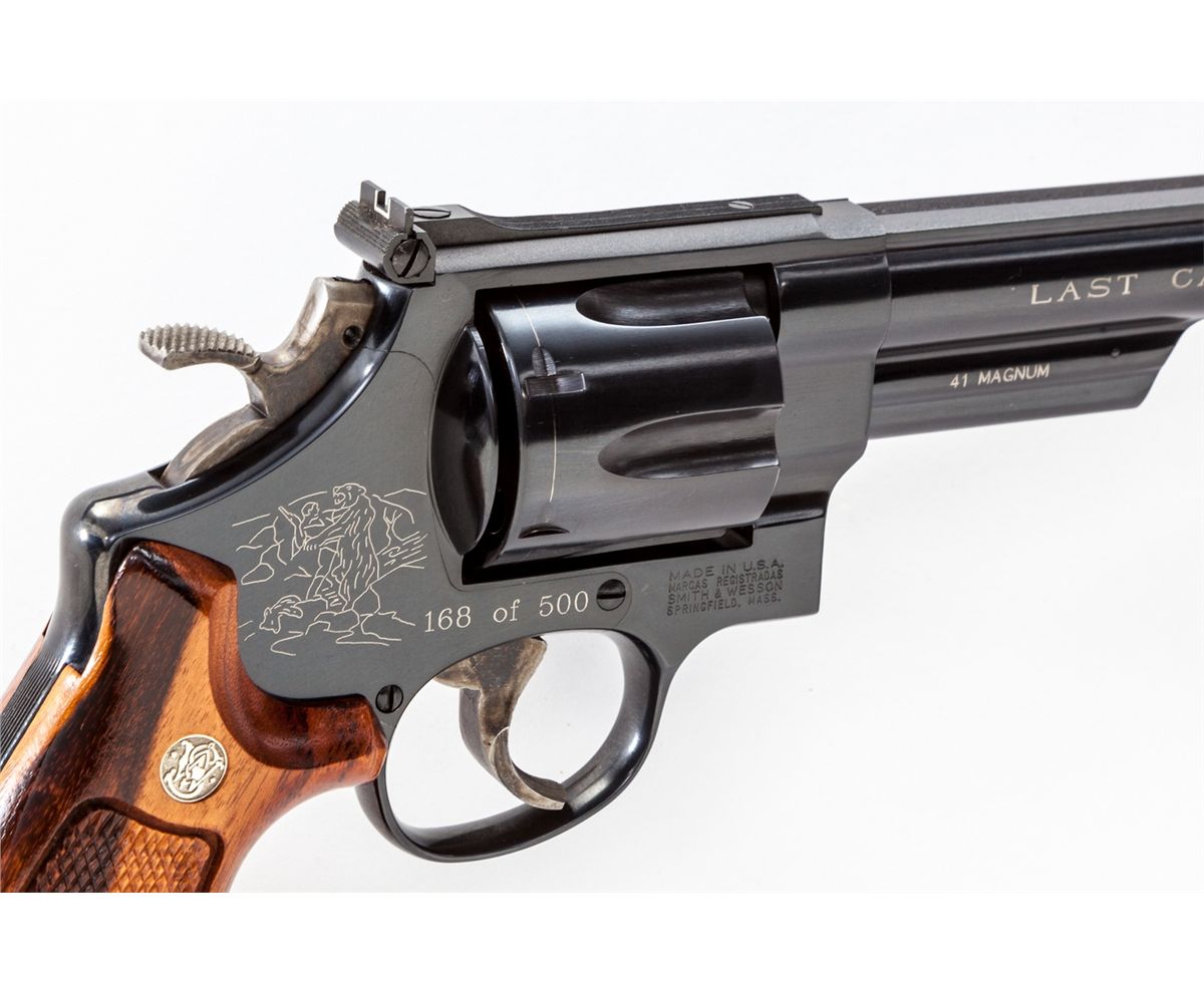 Smith & Wesson Model 57-3 Double Action Revolver, #BSA9815, .41 cal., 6'' barrel, blue finish, factory checkered target grips, with red ramp front sight and white outline rear sight. Right side of barrel is etched with ''Last Cartridge'', with laser etched facsimile of the 1902 Dan Smith painting that was used in poster form to advertise S&Ws. Sideplate is additionally marked ''168 of 500''. Condition is excellent with only a very light trace of index mark to cylinder. In original two-piece metal-cornered S&W box with instructions and cleaning accessories. May edition. Est.: $600-$800. (Modern)