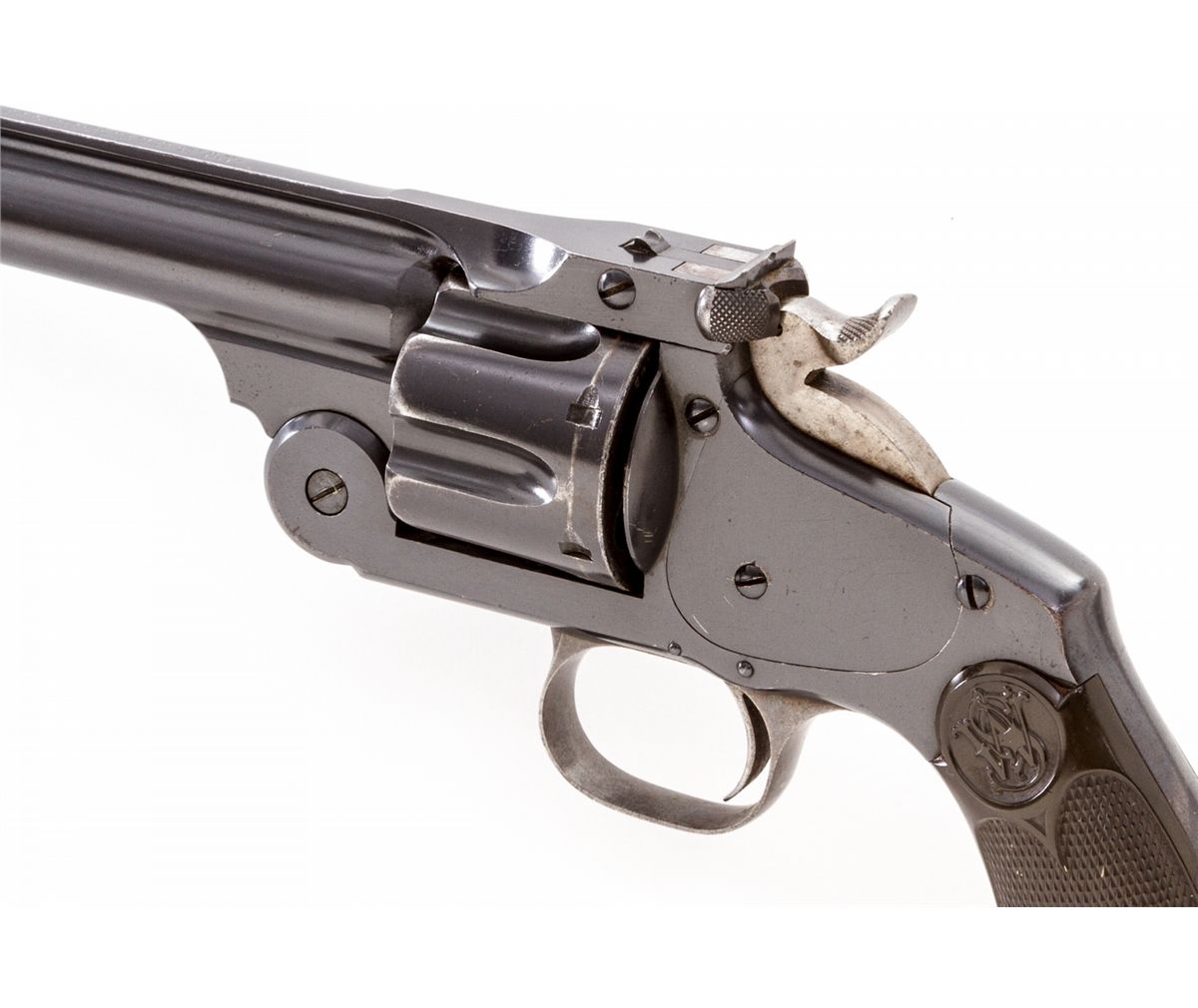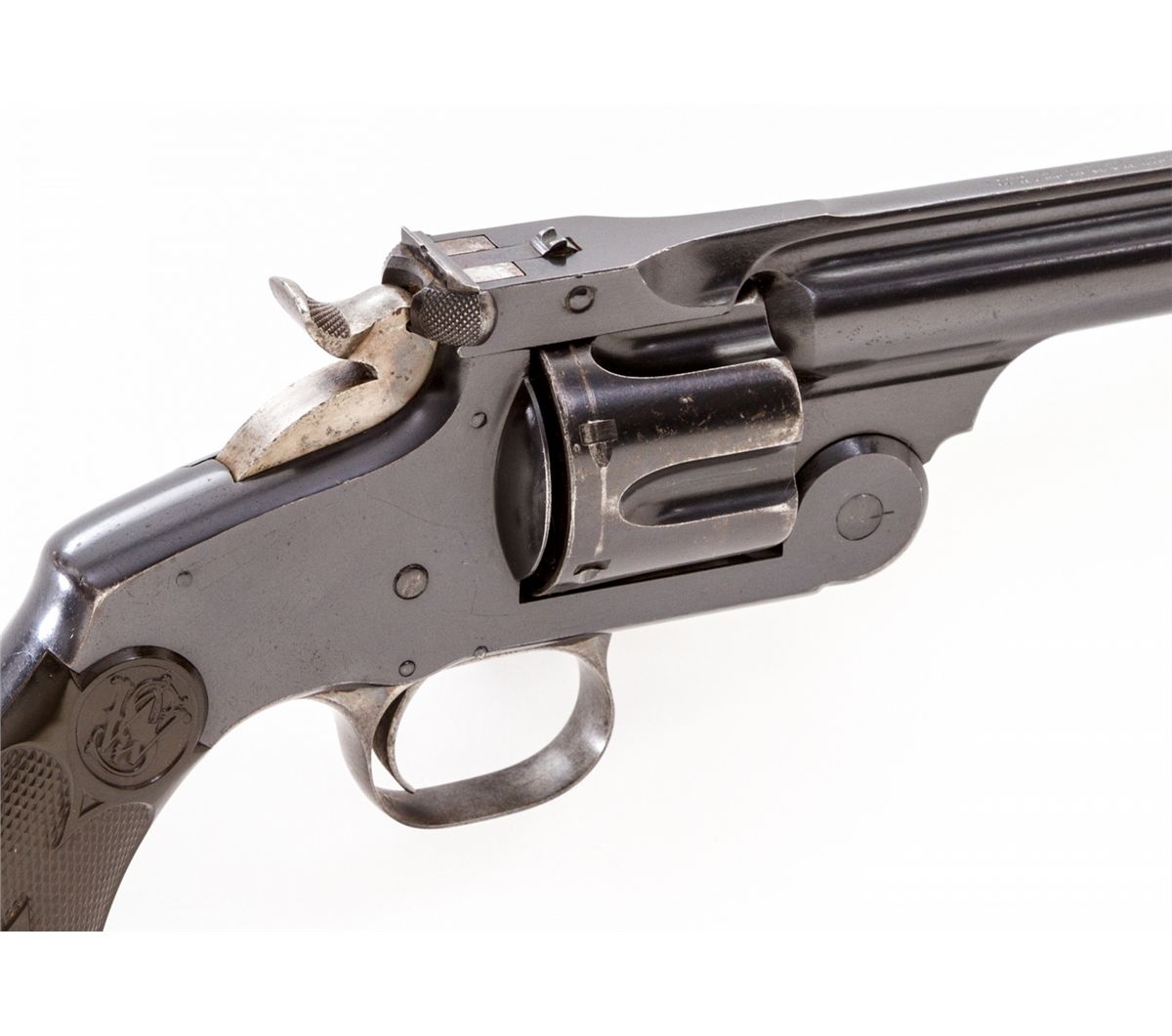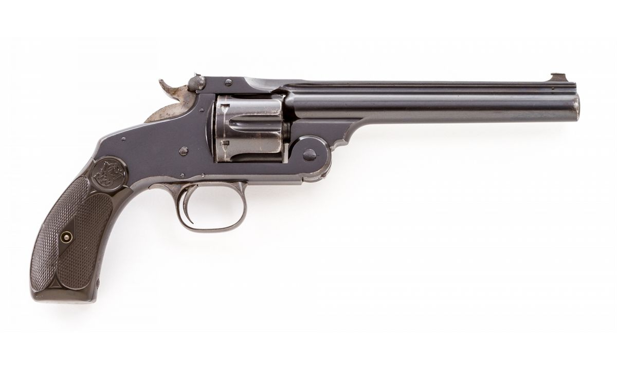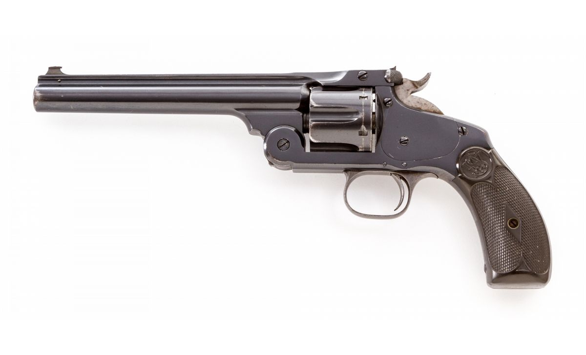 Smith & Wesson New Model No. 3 Target Single Action Revolver, #572, .32-44 cal., 6-1/2'' barrel, blue finish, factory checkered hard rubber grips, with fine bright bead front sight and standard target rear sight. Serial number with star suffix indicating return to factory for repair or refinish. Considered quite scarce with only slightly more than 4300 mfg'd between 1887-1910. Condition is fine as possibly factory refinished, with 94% blue, which includes thinning at muzzle, losses to cylinder, and at high edges. Grips with minor flattening. Good crisp target action and a good bore. Est.: $800-$1,200. (Antique)