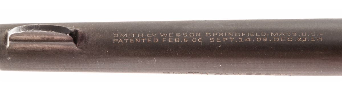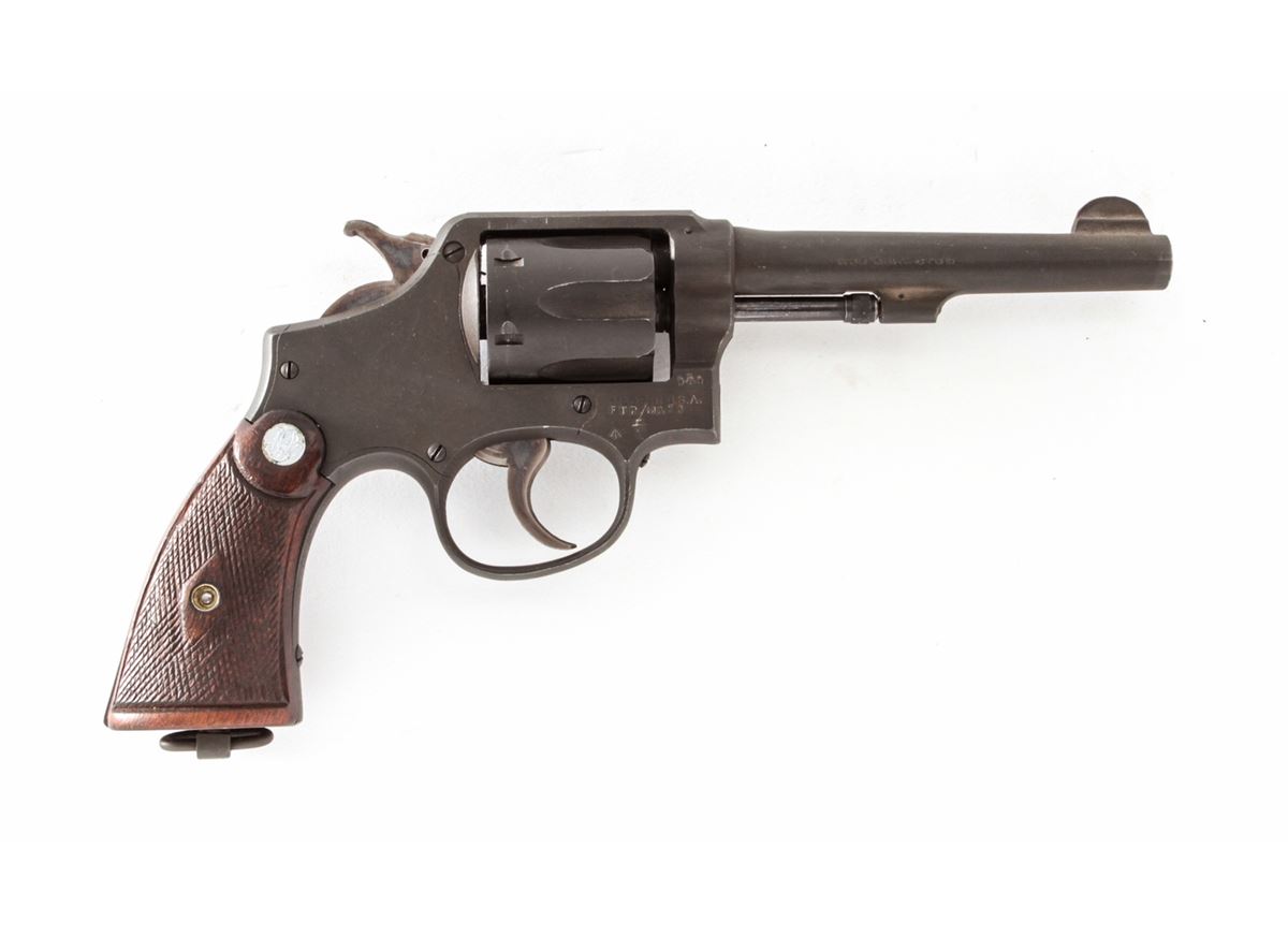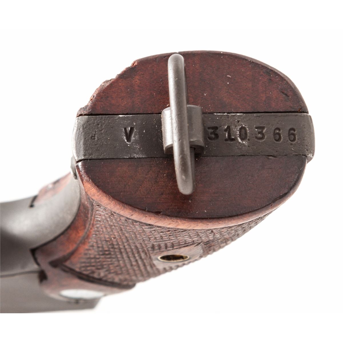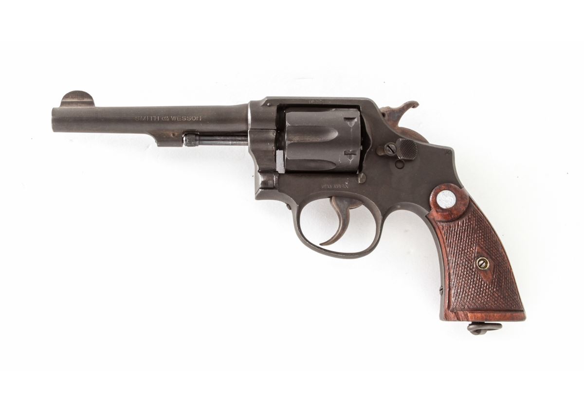 Smith & Wesson Victory Model Double Action Revolver, #V310366, .38 S&W cal., 5'' barrel, parkerized finish, somewhat earlier factory checkered S&W commercial walnut grips, with lanyard loop in butt. Condition is near excellent retaining approx. 96% parkerized finish. Grips with mild flattening. Good action, bright bore. Lightly import marked with English proofmarks. Est.: $350-$500. (C&R/PPT)