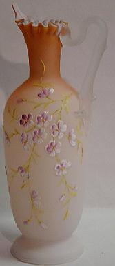 with pale shaded pink at the base becoming salmon pink at top, footed elliptical body with crimped shaped rem and lip, having a satin finished clear applied handle, floral enameled, height 9 ½", American, circa 1880's.