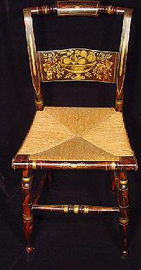 and one matching armchair, black painted / grained / stencil decorated / gold trimmed with rush seats, American, circa 1815-1835.
