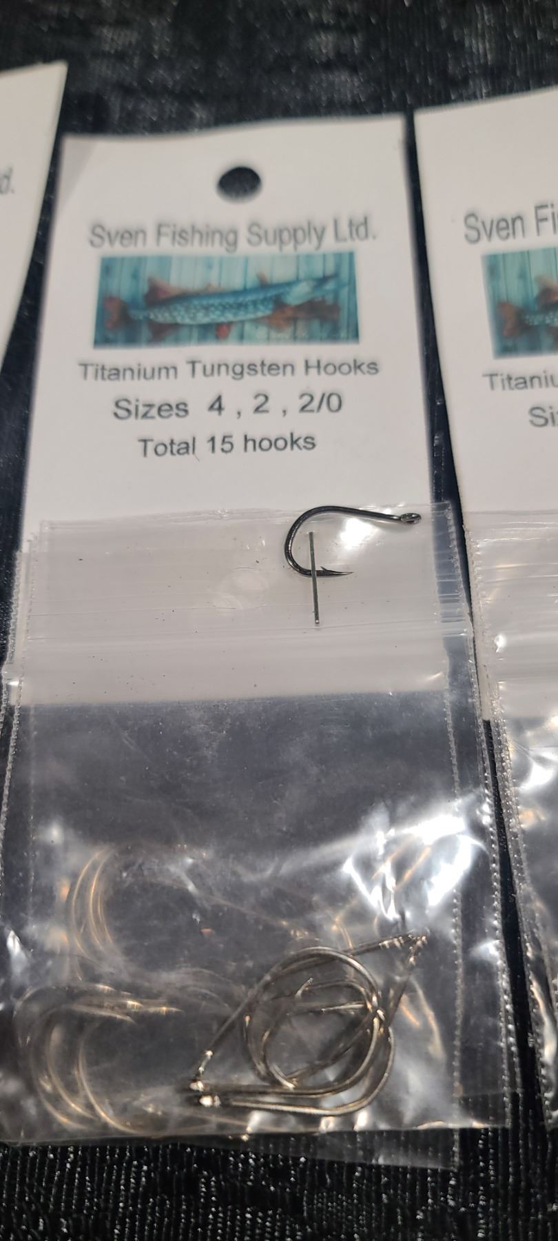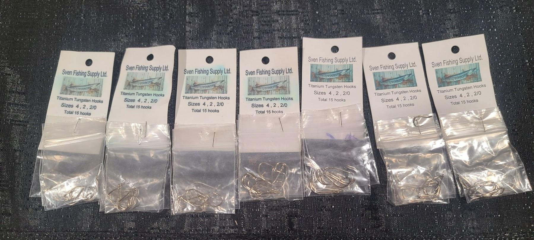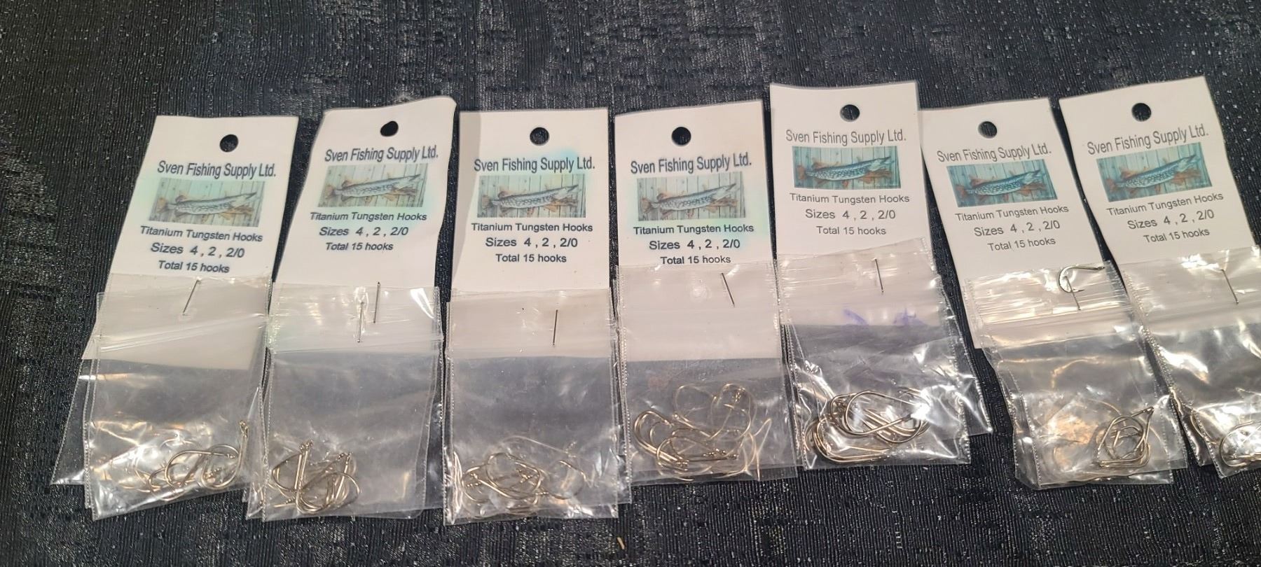 SEVEN MULTIPACKS OF TITANIUM TUNGSTEN HOOKS SIZES: 2, 4, 2/0 - 15 HOOKS PER PACK