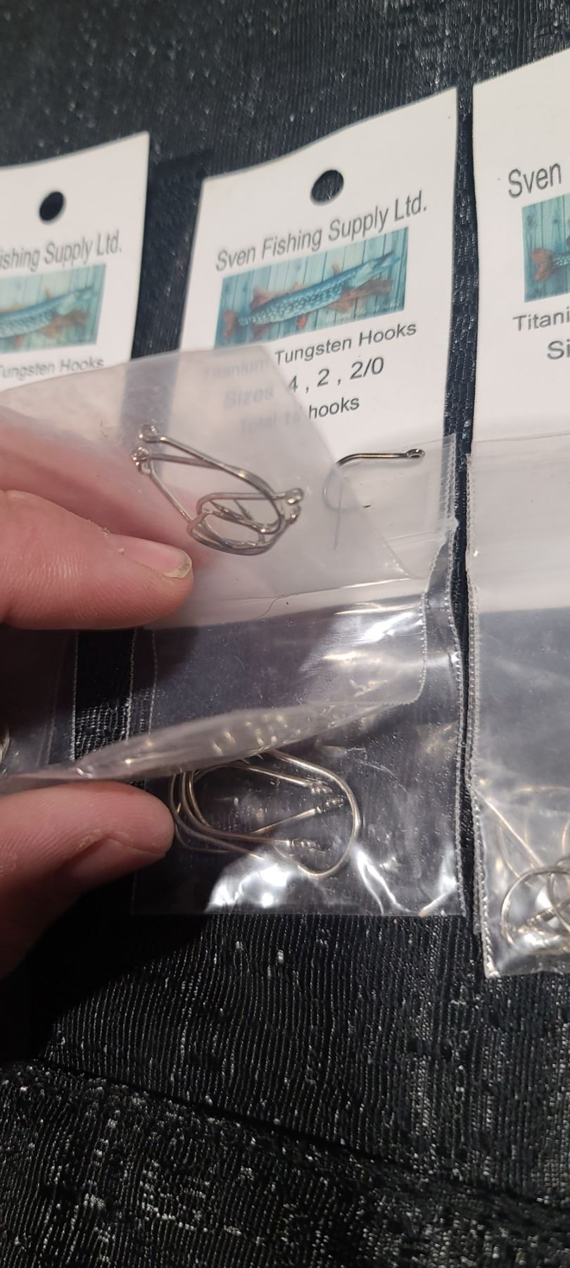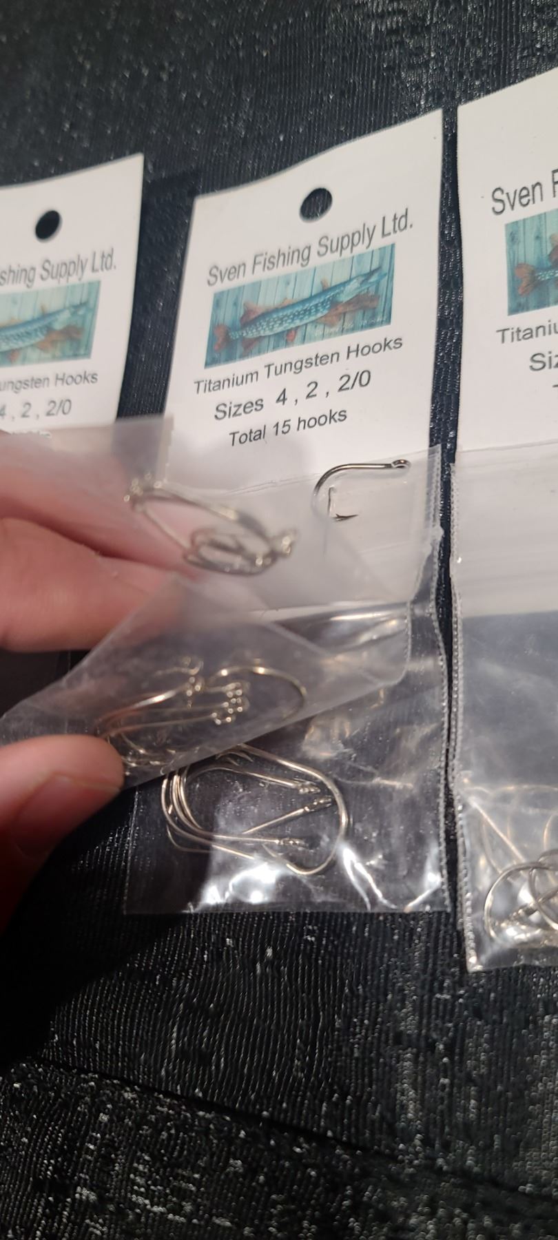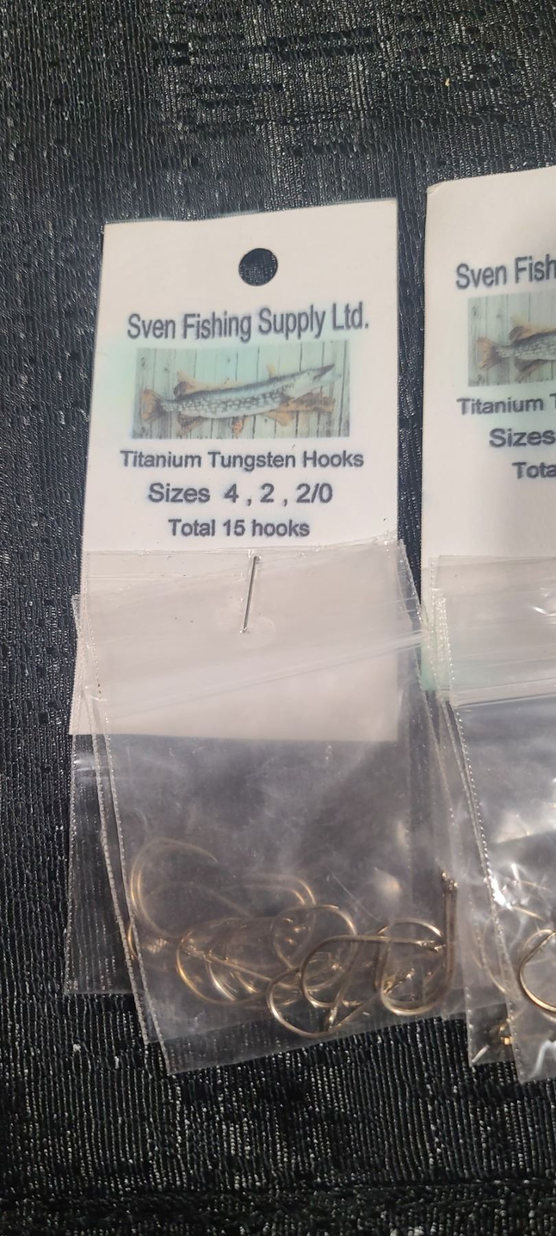 SEVEN MULTIPACKS OF TITANIUM TUNGSTEN HOOKS SIZES: 2, 4, 2/0 - 15 HOOKS PER PACK