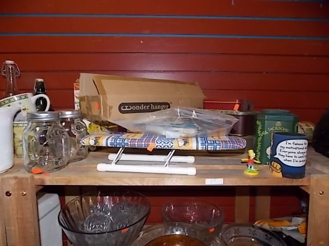 SHELF LOT OF COLLECTABLE & HOUSE HOLD - INCLUDING MASONARY MUGS, COLLECTABE TINS AND MORE
