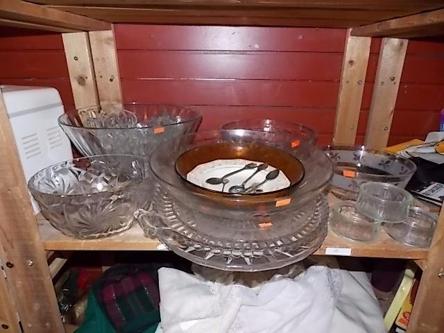 SHELF OF GLASSWARE, PLATES & MORE