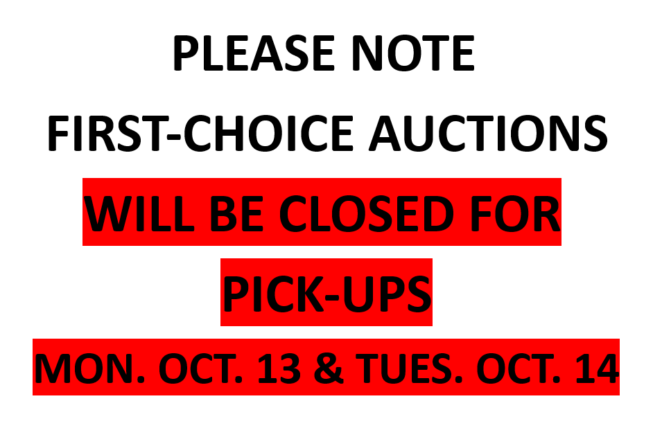 ***PLEASE NOTE FIRST-CHOICE AUCTIONS WILL BE CLOSED OCT. 13 & 14 FOR PICK-UPS***