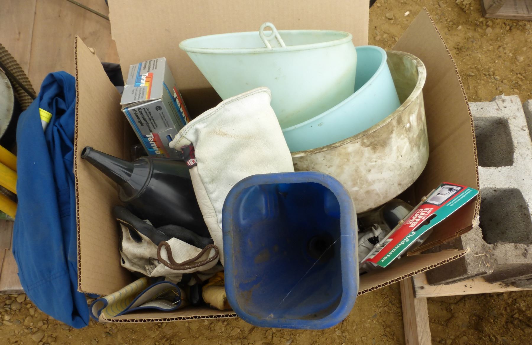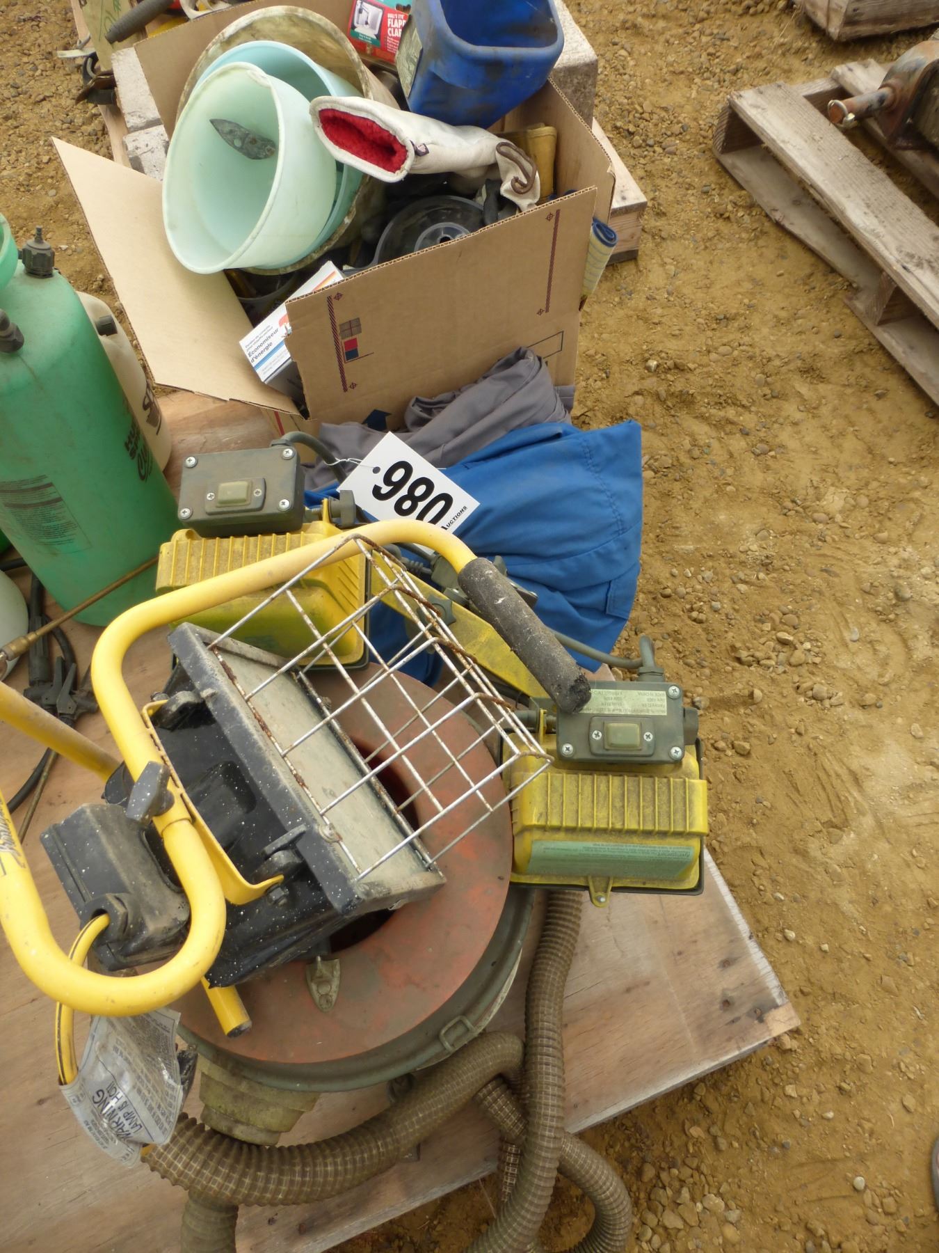 SHOP VAC, 2 WORK LITES, COVERALLS, FUNNELS, PLUMBING SUPPLIES, WIRE, BLOCK HEATER CORD, ETC