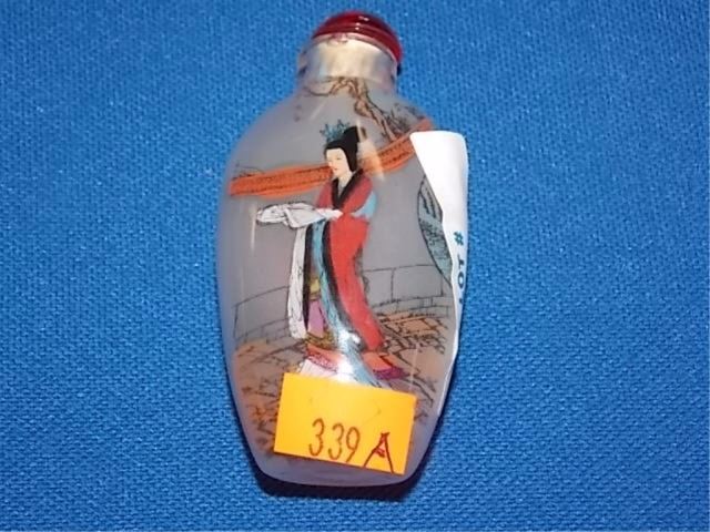 SNUFF BOTTLE - HAND PAINTED - WITH LID - LADY WITH RED & BLUE DRESS