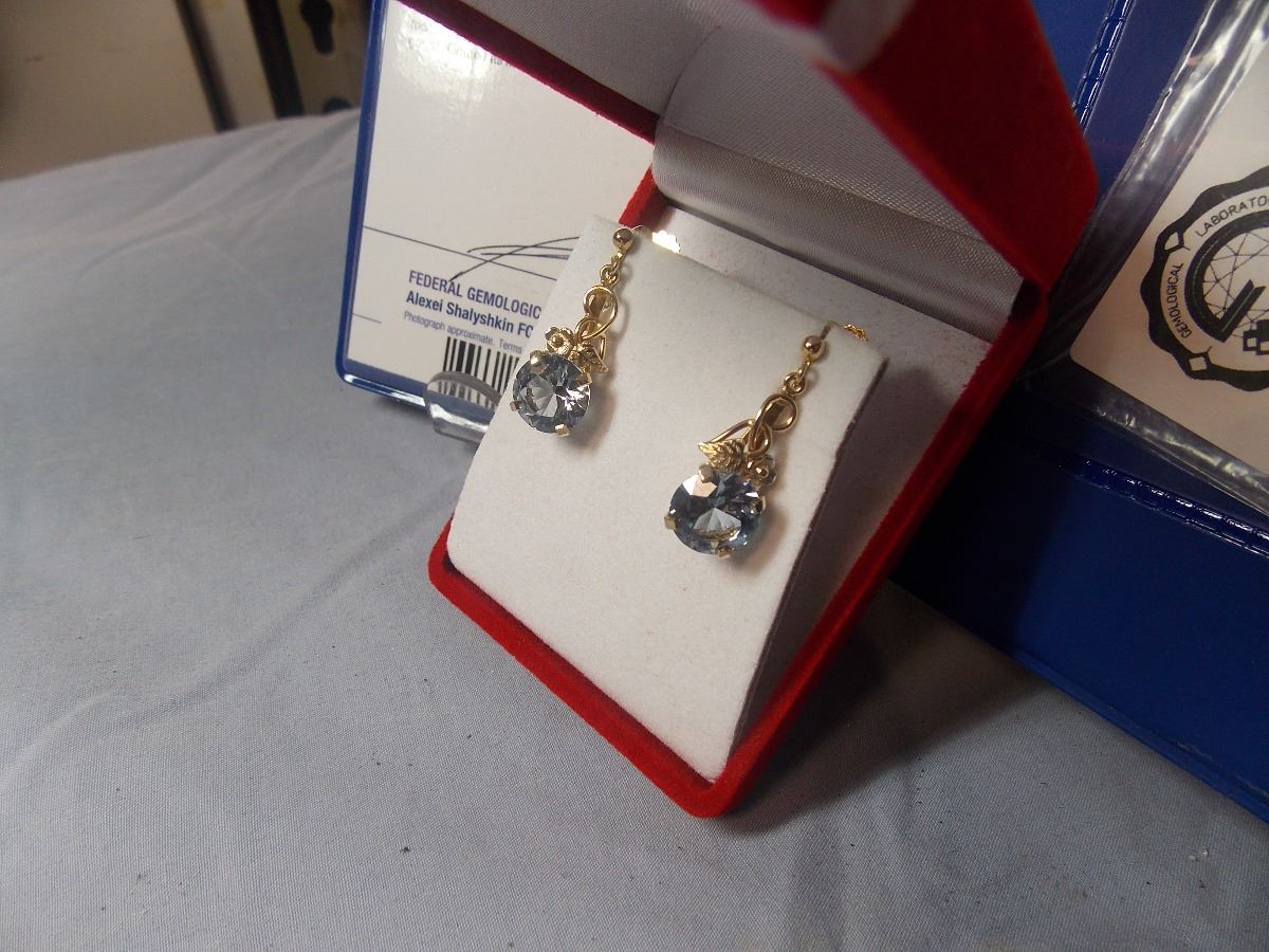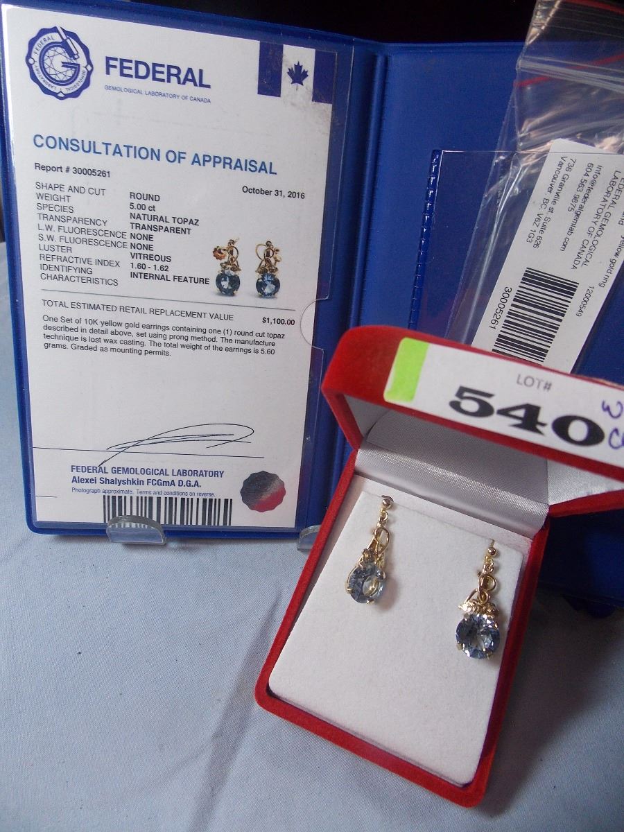 **SPECIAL FEATURE - EARRINGS - 10K YELLOW GOLD - 5 CT BLUE TOPAZ - SCREW BACK CLASP - FROM ESTATE - WITH APPRAISAL $1100 - W-85