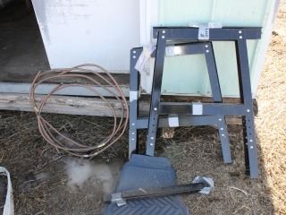STEEL SAW HORSE, PLATE OF STEEL, ROLL OF WIRE LOCATED IN HOG BARN