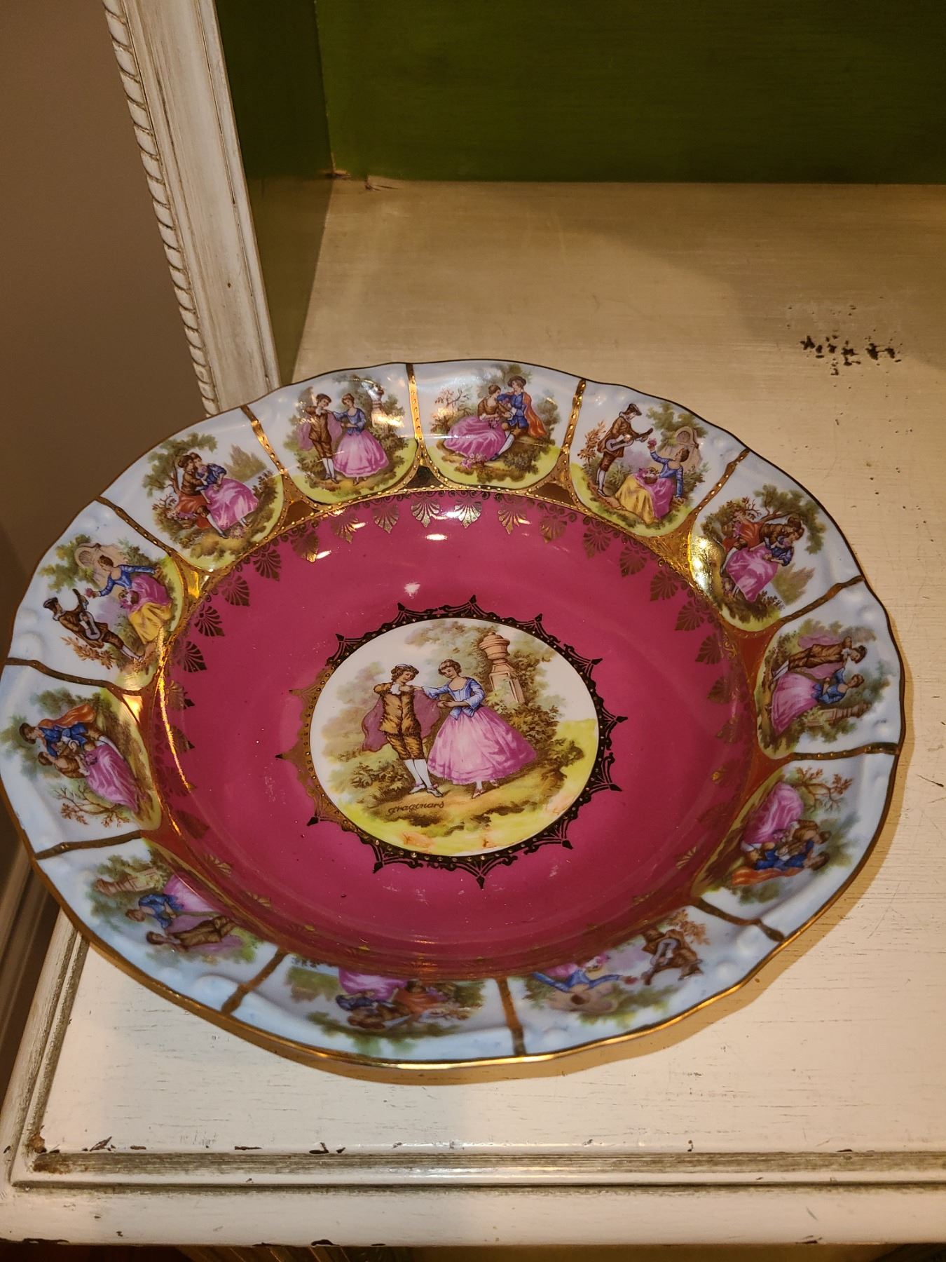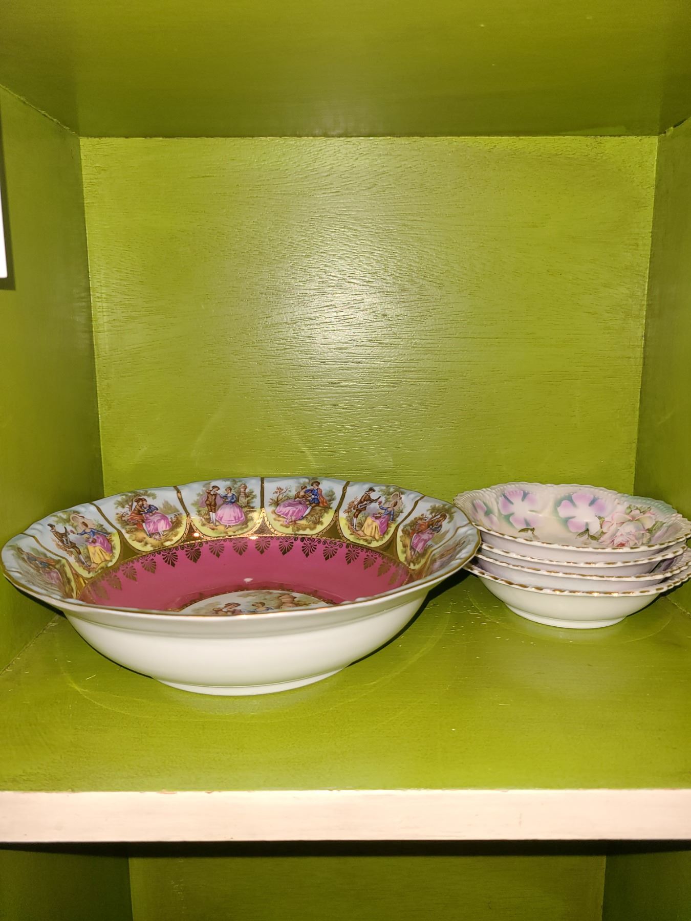 Collectors bowl rose with gold, 4 fruit nappies from Germany. Please bring packing material and pick up 9 am