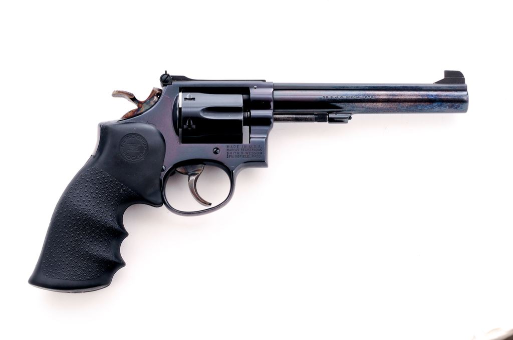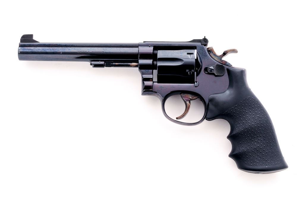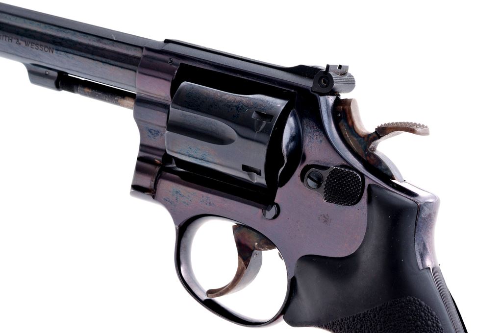 Smith & Wesson Model 14-2 K-38 Target Masterpiece Double Action Revolver, #K523946, .38 Spec. cal., 6'' pinned barrel, dark blue finish, finger grooved and stippled black rubber Hogue grips, Patridge front sight, fully adjustable square notched rear sight, with color case hardened checkered wide spur hammer and wide target trigger. Mfg'd 1963. Revolver is in fine+ overall condition with approx. 97% high polish factory blue. Metal with scattered light scratches and other small marks, a few of which are covered by the rubber grips. Cylinder with a thin light index line. Grips show moderate wear. Nearly all of the vibrant case colors remain. Action is crisp with a smooth hammer and trigger, with an excellent bright and shiny bore. Est.: $450-$650. (C&R/PPT)