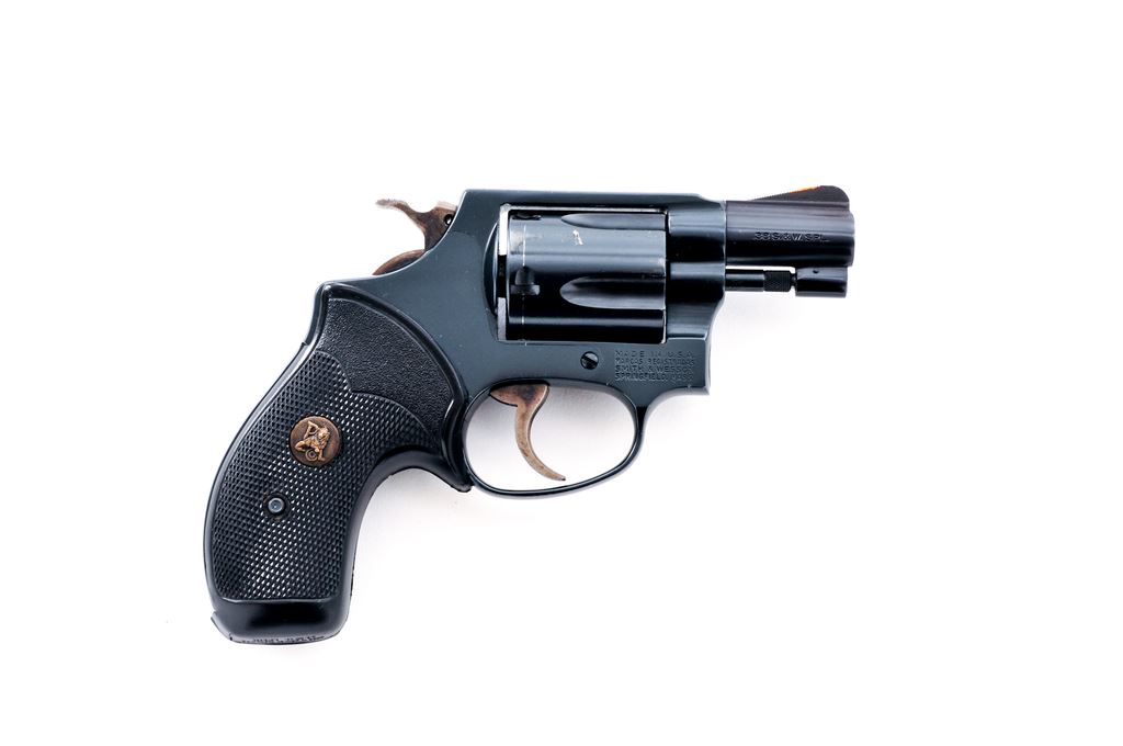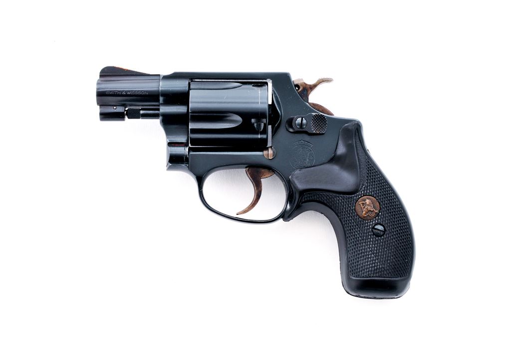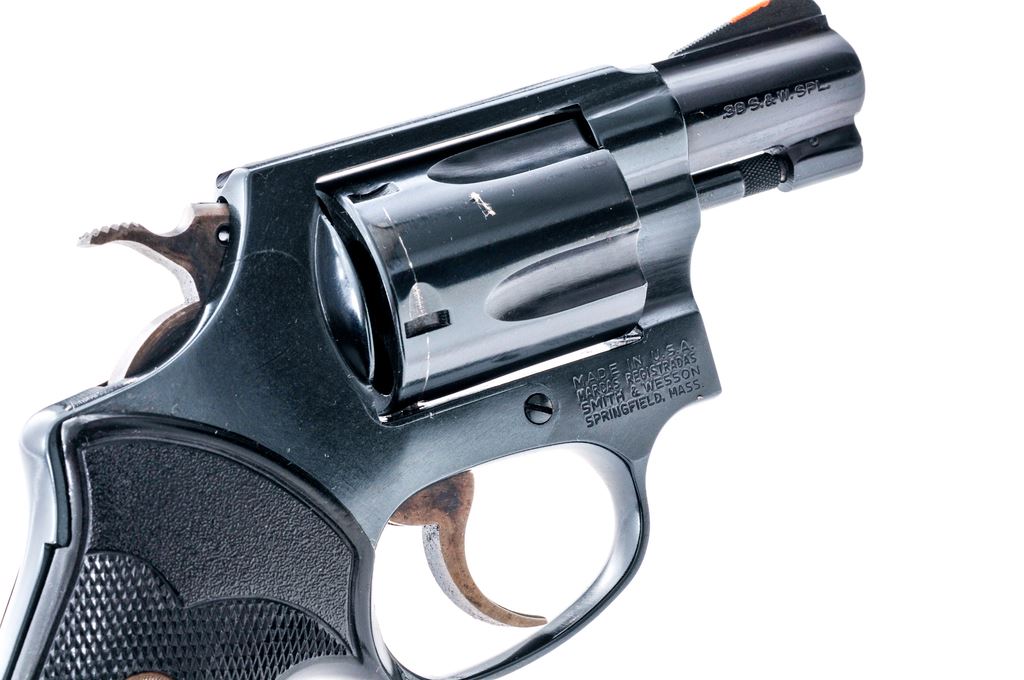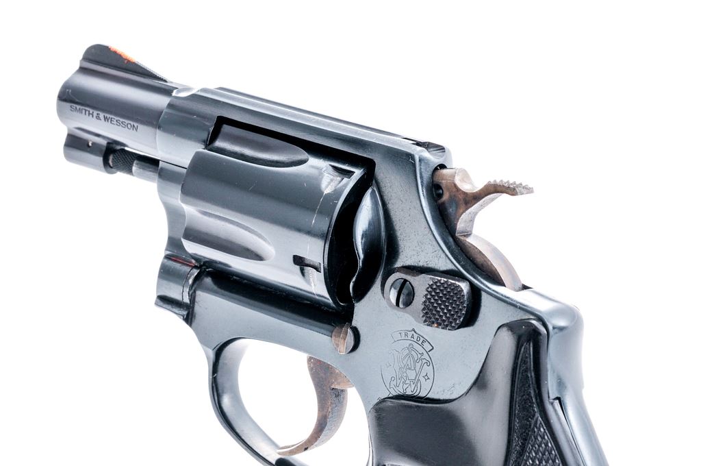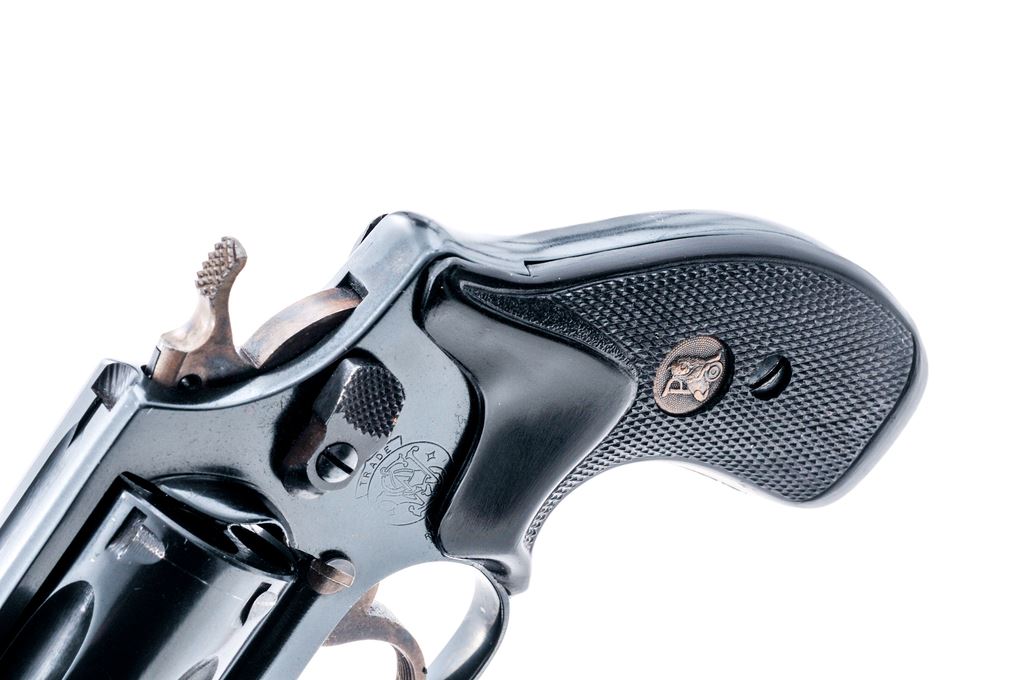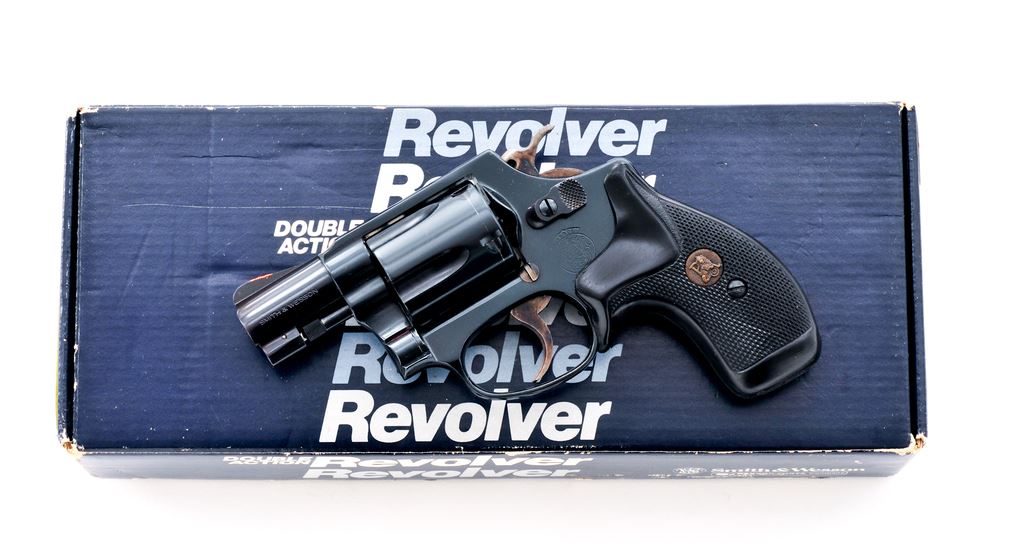 Smith & Wesson Model 36 Chief's Special Double Action Revolver, #1J32650, .38 Spec. cal., 1.9'' barrel, blue finish, checkered black rubber Pachmayr grips, case hardened hammer and trigger with standard fixed sights; ramped front sight with added orange paint. In original one-piece box with matching end label, sealed cleaning kit, owner's manual, and other factory paperwork. Revolver rates near excellent, with approx. 98% factory blue and 95% case colors, showing just light handling marks; cylinder with a thin index line. Grips with clean, sharp, checkering. Action and bore are both excellent. Est.: $400-$600. (Modern/PPT)