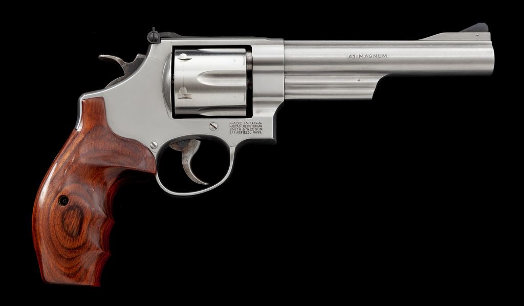 Smith & Wesson Model 657-4 Double Action Revolver, #CCZ1244, .41 mag. cal., 6'' barrel, satin stainless steel, laminate finger-grooved wood grips, ramped front sight and square notched fully adjustable rear sight. In original blue plastic case with matching end label and owner's manual. Revolver rates as fine and shows normal signs of moderate range use. Metal with scattered light micro-scratching; cylinder with a moderate index line and some spots of powder staining. Grips with nearly all of their semi-gloss finish; left grip with a few tiny impressions from handling. Action is crisp with a near excellent bright bore. Est.: $500-$750. (Modern) (Not available to Calif. residents.)