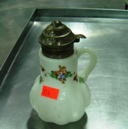 WHITE MILK GLASS PAINTED SYRUP DISPENSER, LID SHOWS WEAR