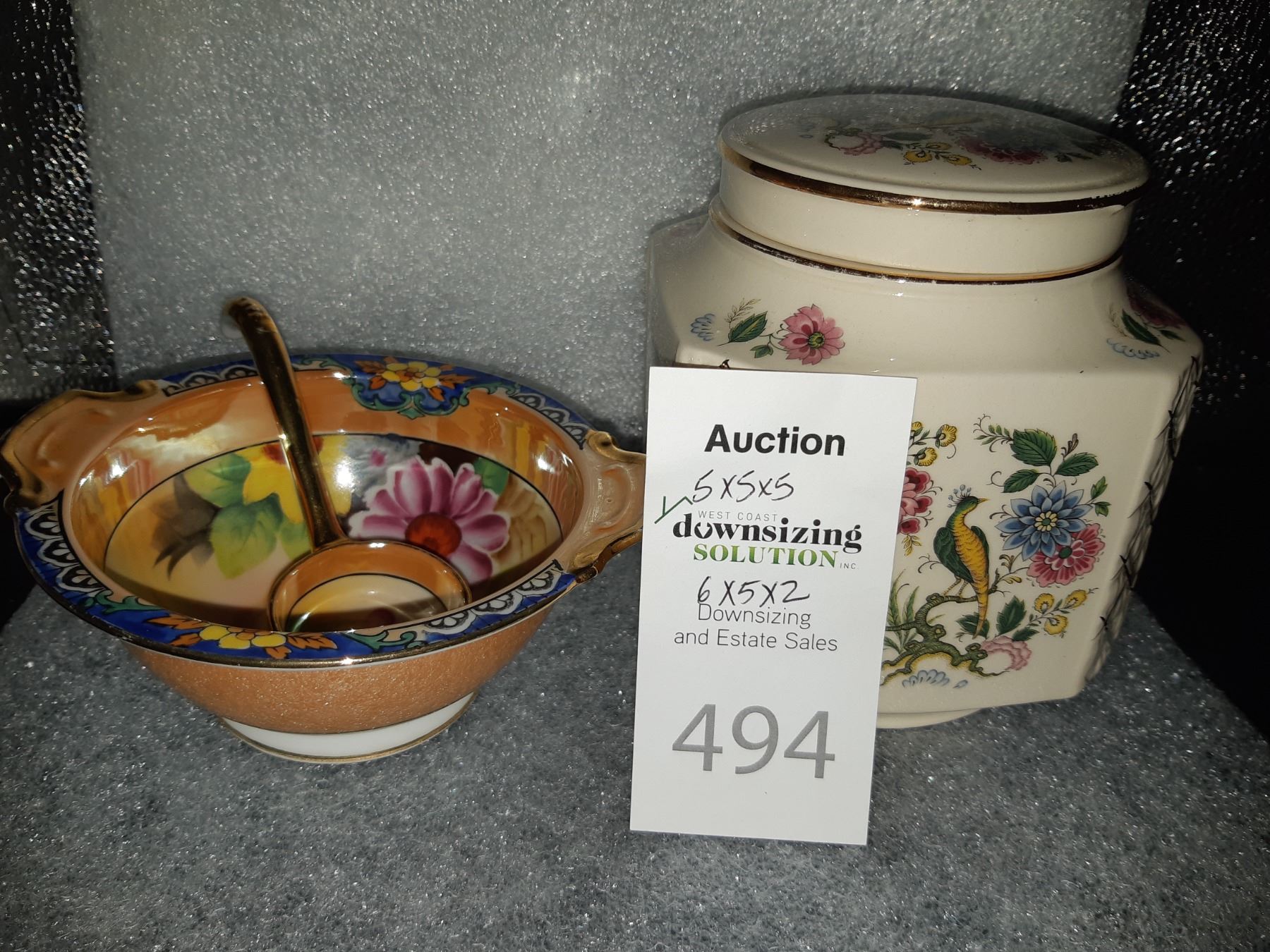 Saddler lidded Tea Caddy 5x5x5 and Noritake bowl with spoon 6x5x2 Bring packing supplies & pickup at 10 am