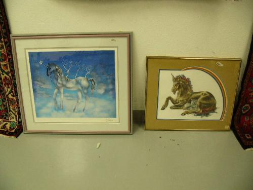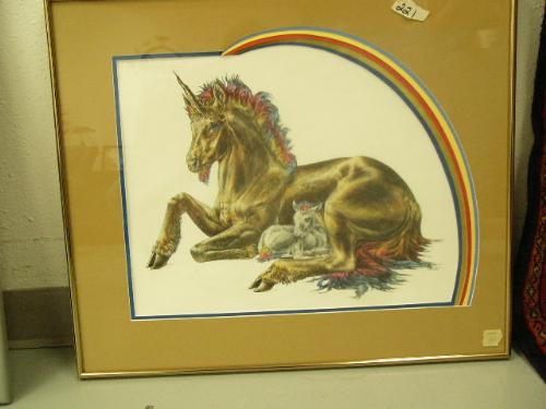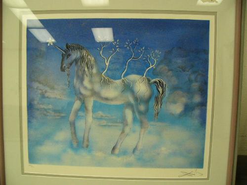 Salvador Daly print signed and numbered 244/300 and double matted and framed print of unicorn by M. Pena (155)