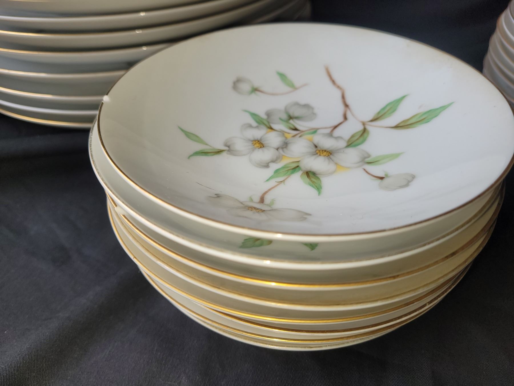 8 x Dinner Plates, 8 x B&B Plates, 8 X Soup, 8 x Fruit, 8 x Cup & Saucers, 1 Gravey Boat with Spill Tray. 1x Creamer, 1 x Sugar, no lid. 1 x 14x10" Platter and 1 x 11x8 Oval Divided Serving Dish. SC2 Pickup at 9 am