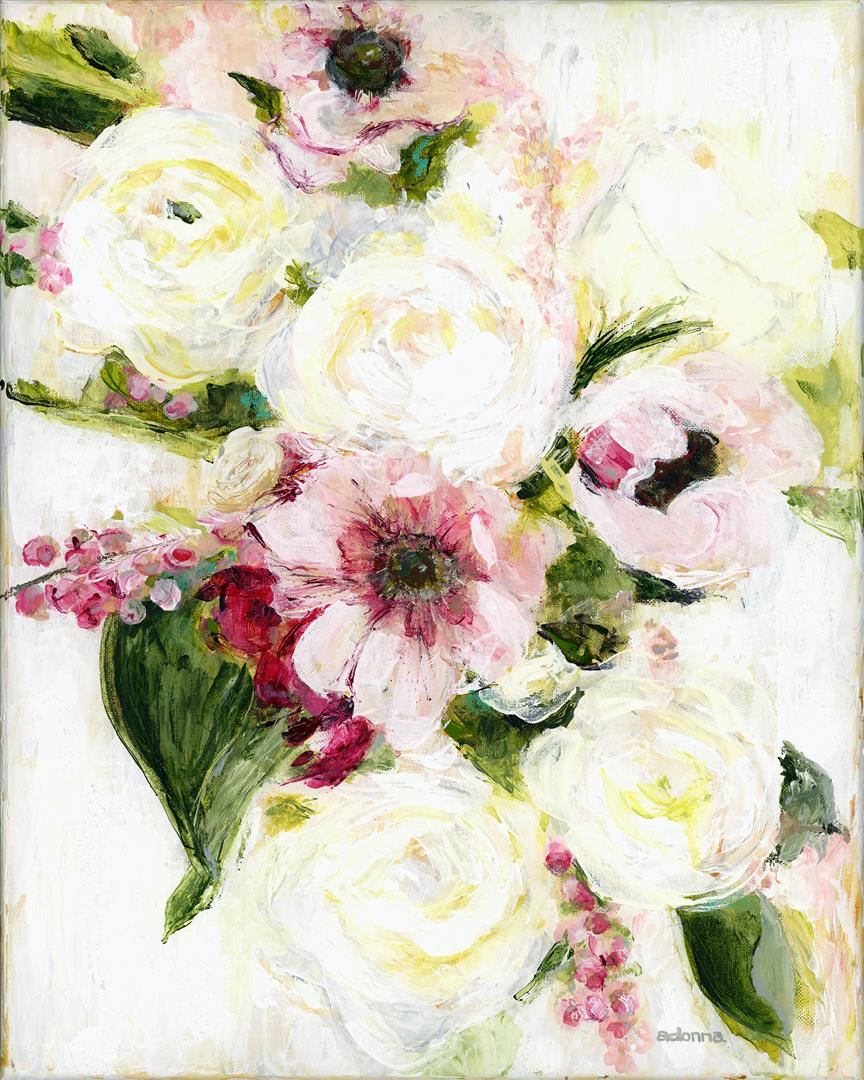 An original Acrylic / Oil pastel on stretched canvas by Adonna 16 x 20. Vintage meets modern with this soft bouquet of flowers.