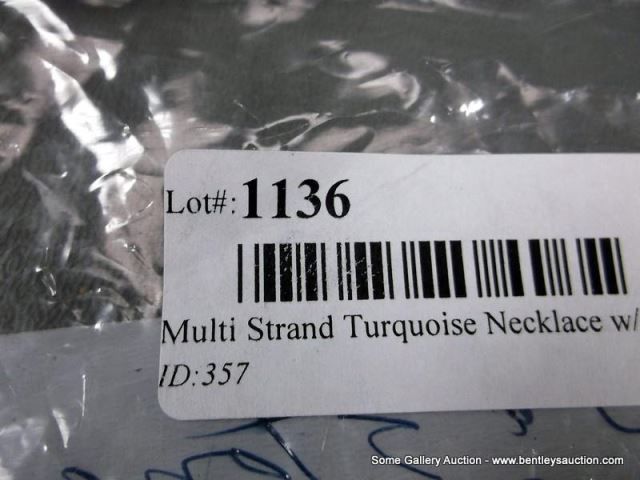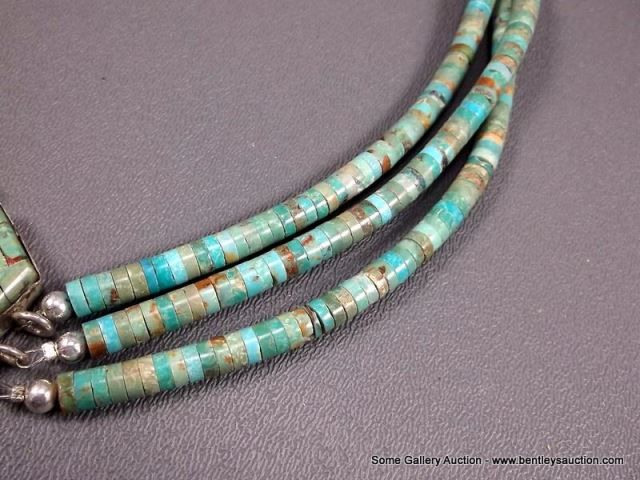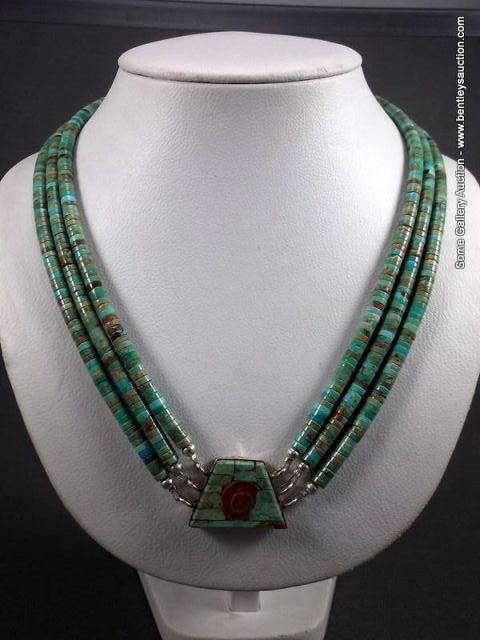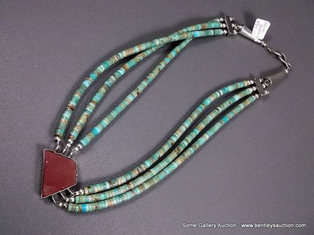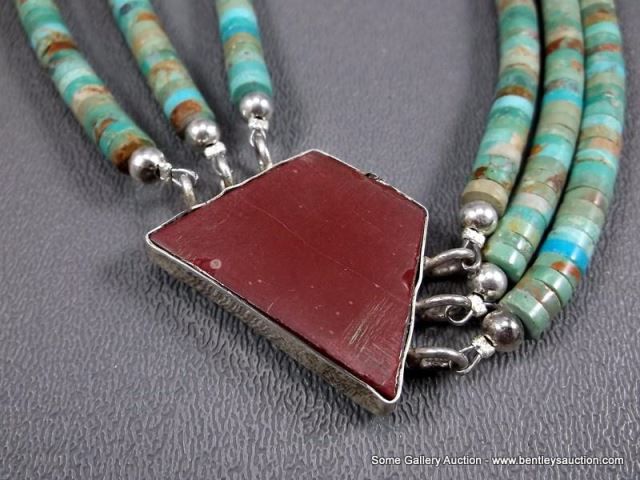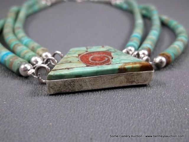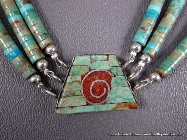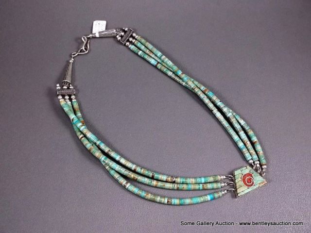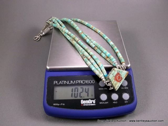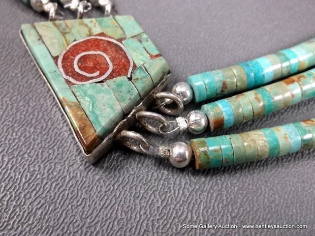 Santa Domingo Multi Strand Turquoise Necklace w/ Inlaid Pendant-Marked Timothy Bailobi Weight: 102.4