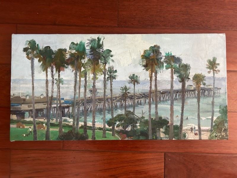 An original painting of the Santa Monica pier by Roger Bigg measures 20x24 on stretched canvas.