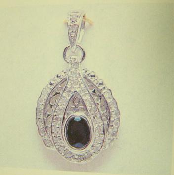 Sapphire and diamond pendant and chain 14K white gold, sapphire oval, faceted, approx. .50 carats, semi-translucent, dark-blue, diamond, single cut, approx. .36 carats, I2, H-I, estimated replacement cost $ 2025.00 (12)