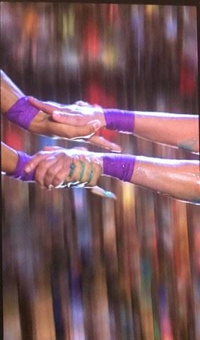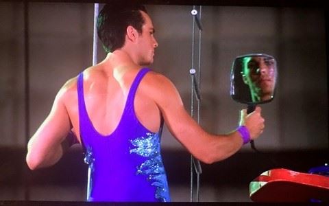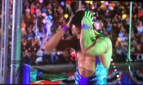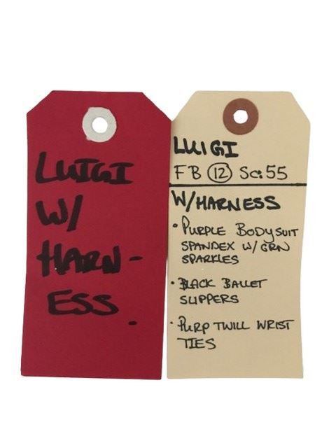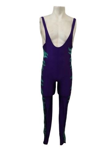 Saving Silverman - Luigi's (Mark Aaron Wagner) screen worn, purple spandex bodysuit, painted with green sparkles. Custom made for the film. Includes costume department wardrobe tag noting this was worn with the harness. Includes screen worn wrist bands shown up close on screen before the fall.