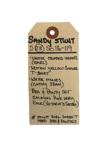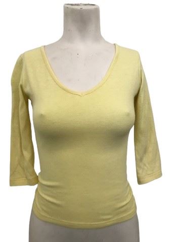 Saving Silverman (2001) - Sandy's (Amanda Detmer) screen worn, stunt, lemon, yellow couture three-quarter sleeve V-neck T-shirt. Includes costume department wardrobe tag.