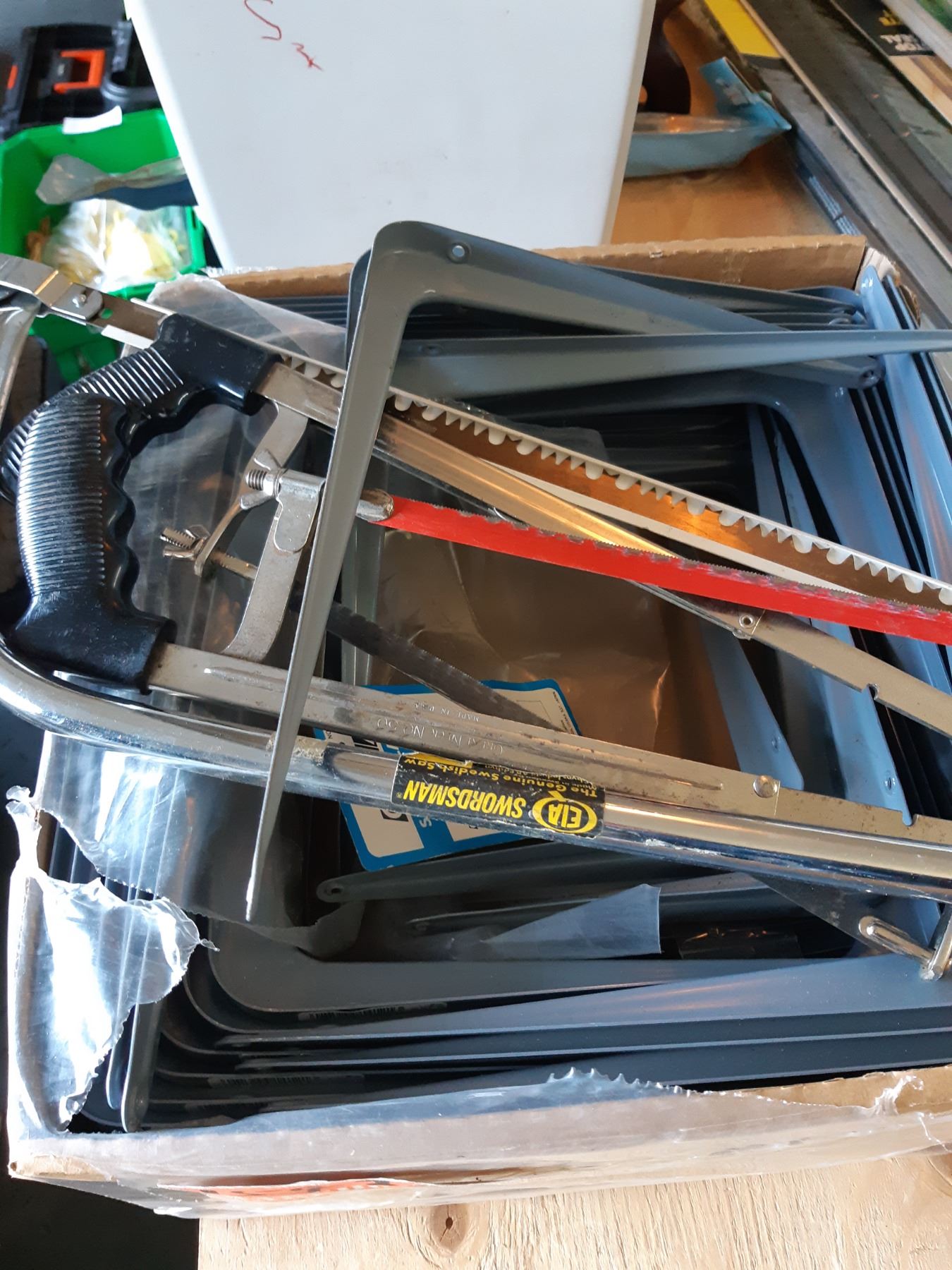 Frames for screens, hacksaws, shelving brackets, plane, wood saws. Pickup at 9:30