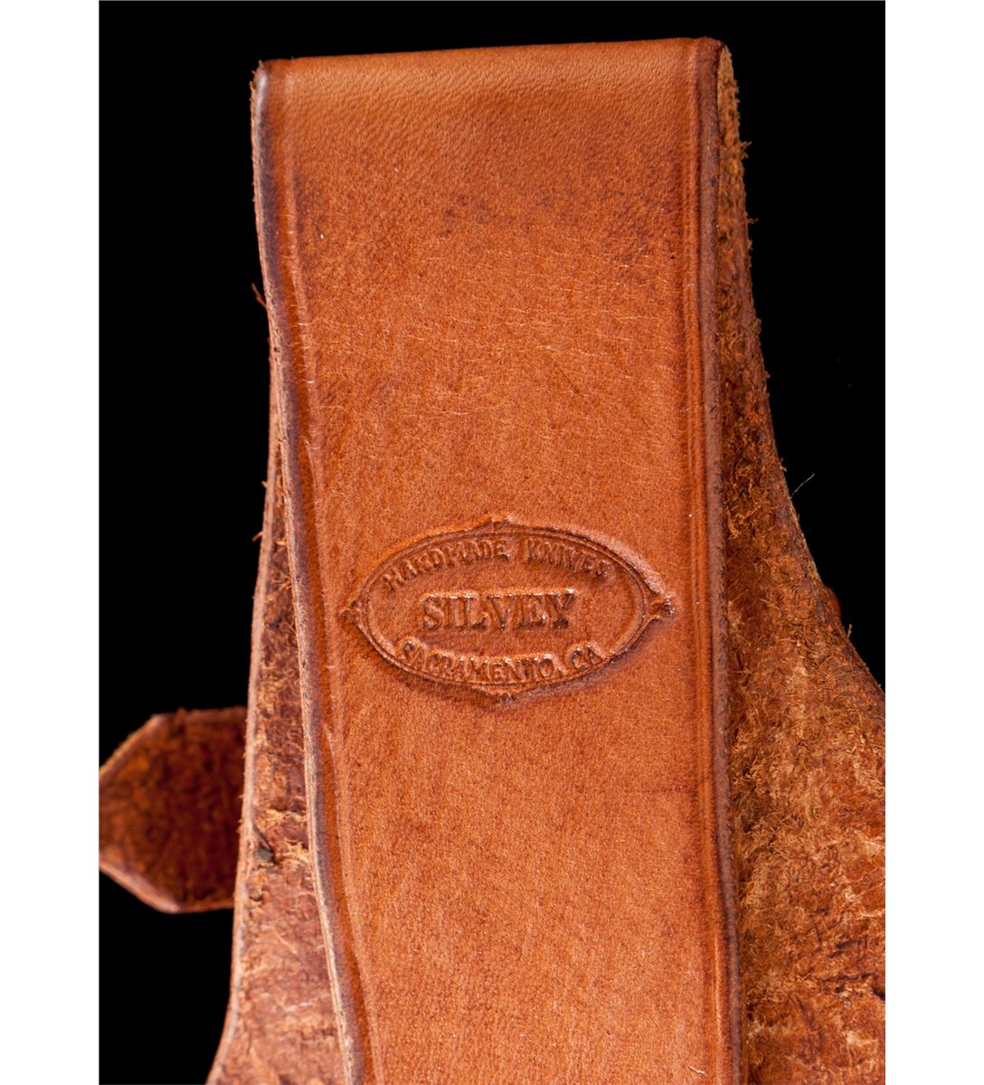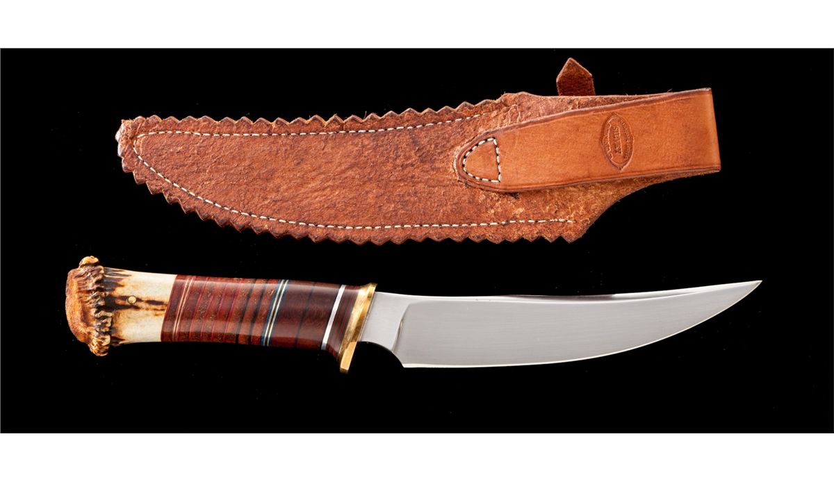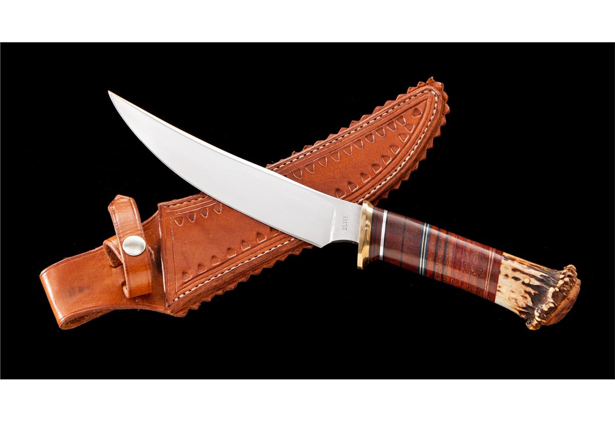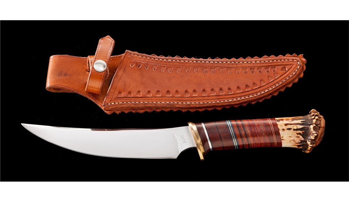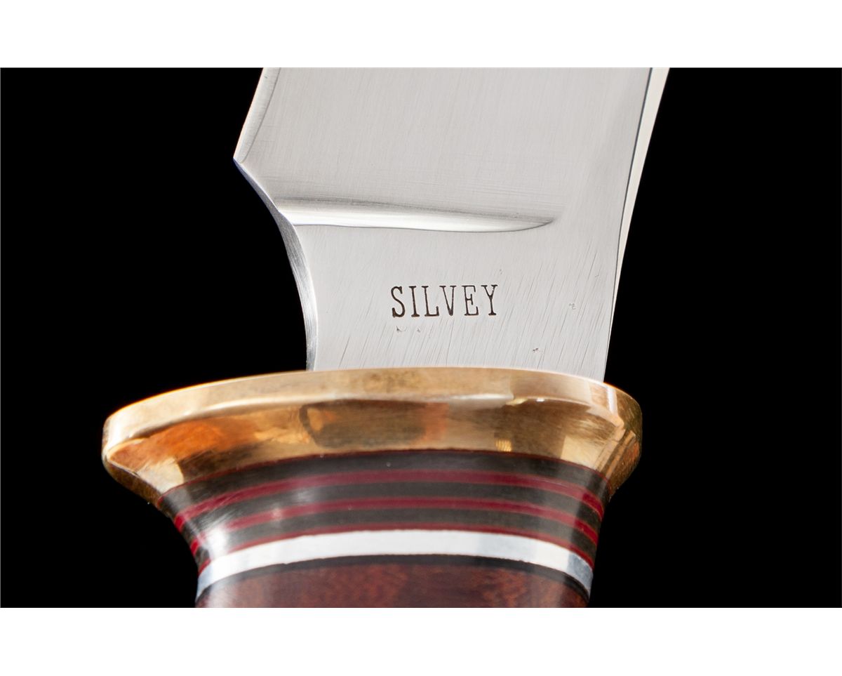 Handmade Custom Scagel Style Knife, by Mike Silvey, 6-3/4'' blade is marked ''SILVEY''. The overall length is 12''. Brass guard with a pinned crown stag pommel. Handle is made of stacked wood and leather washers with an assortment of colored, brass, and aluminum inserts. Leather sheath with decorative roll embossing. The backside of the belt loop is stamped ''HANDMADE KNIVES/SILVEY/SACRAMENTO, CA''. Condition is excellent. Blade with very fine micro-scratching. Leather washers with light handling marks. Leather sheath with tight stitching and seams. Est.: $400-$600.
