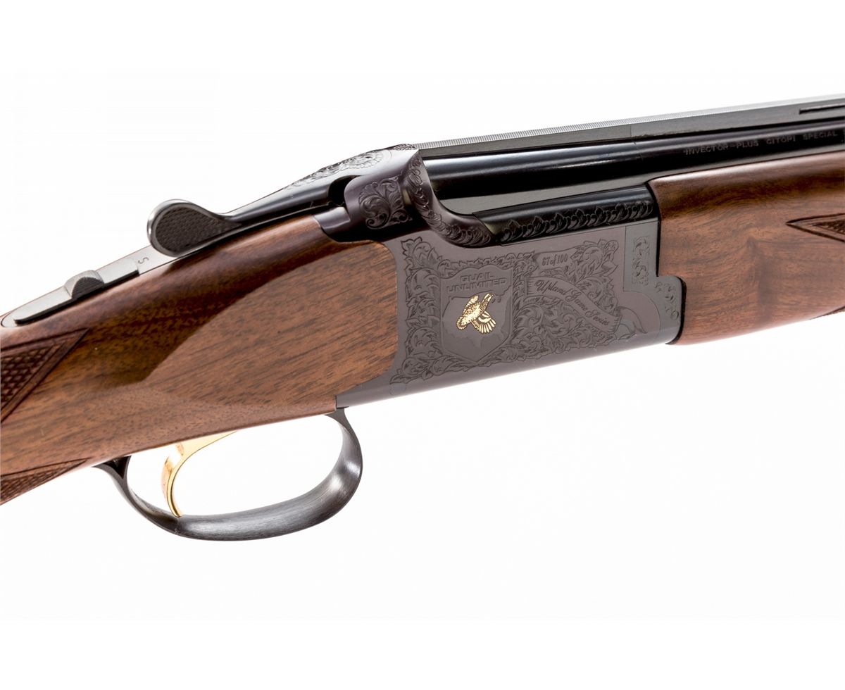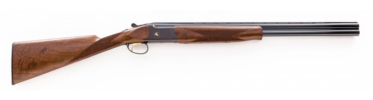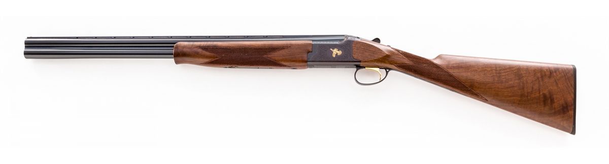 Scarce Browning 1 of 100 Citori Upland Game Series Quail Unlimited Over/Under Shotgun, #97067QUB33, 20 ga., 24'' invector choked vent rib barrels, blue finish, blue frame with applied gold quails, marked #67/100, single trigger, straight checkered walnut stock with factory buttplate. Condition is excellent showing just light marks from handling. Length of pull: 14''. Est.: $1,800-$2,400. (Modern) (Ernest A. Bryant III estate)
