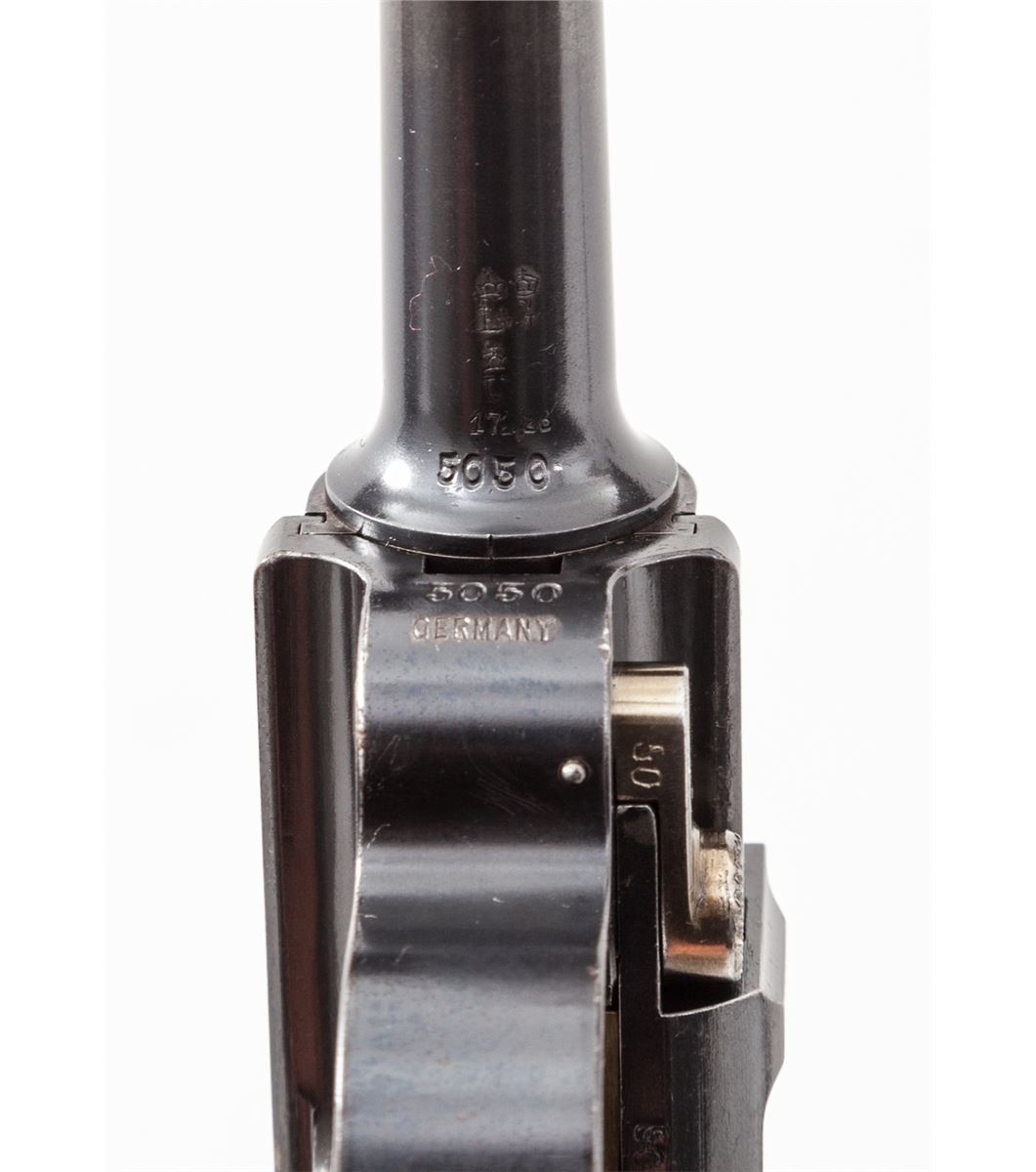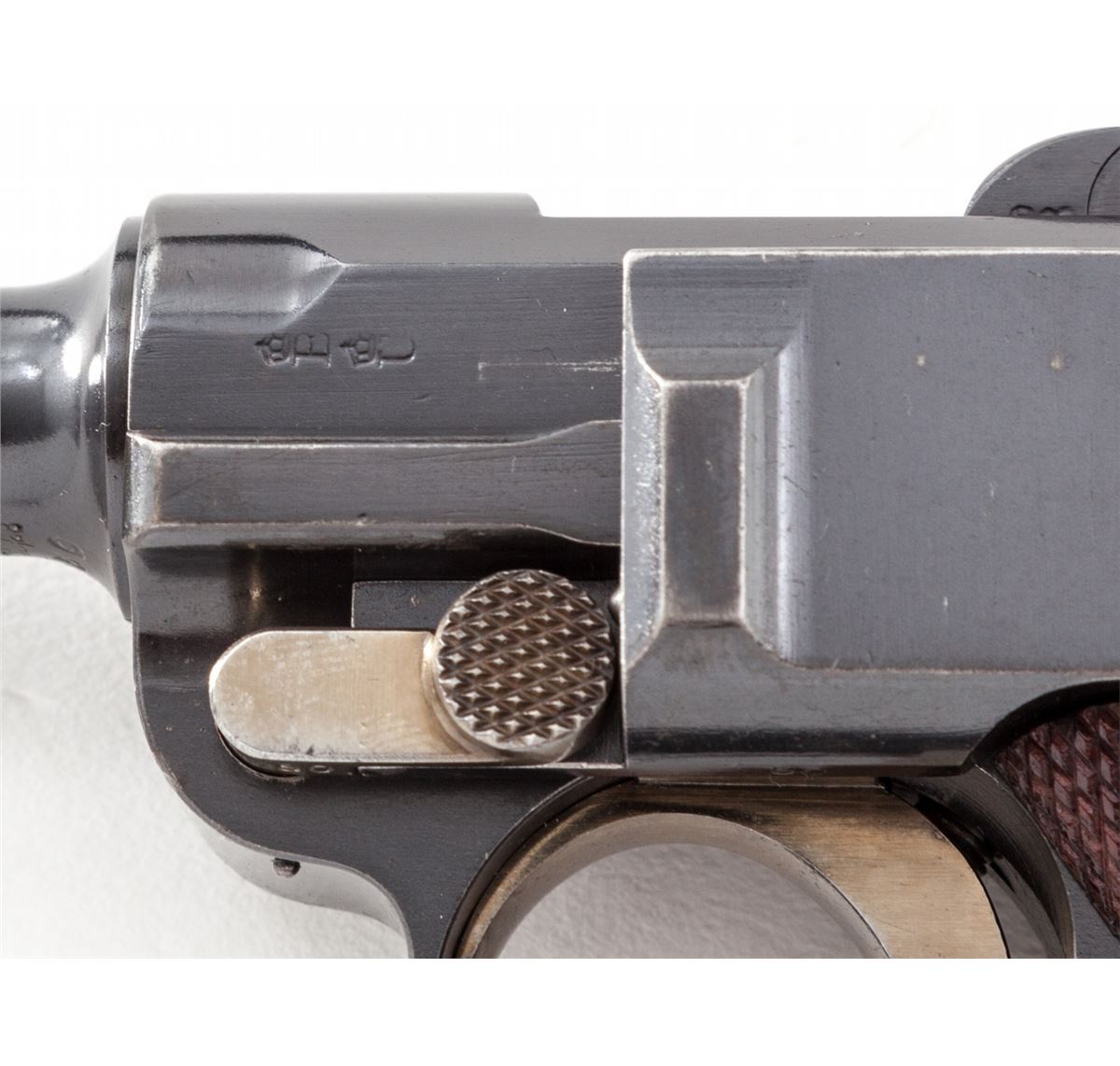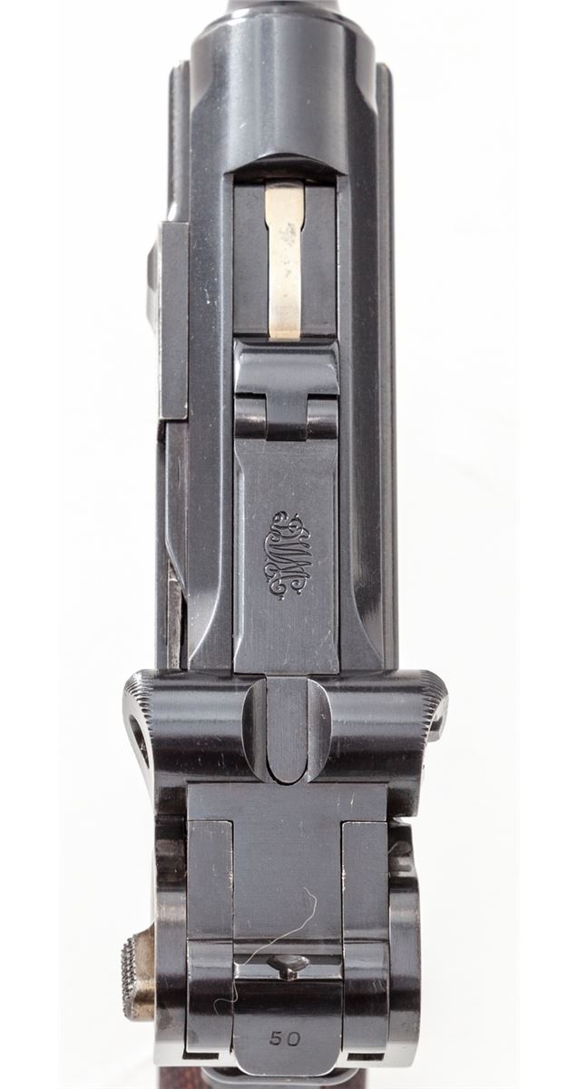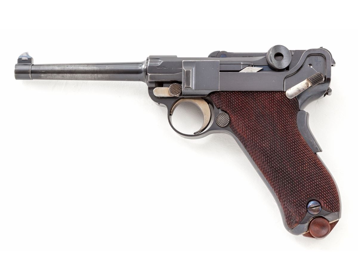 Scarce Early Model 1900 Commercial Luger, #5050, .30 Luger cal., 4-3/4'' barrel, blue with straw small parts, factory checkered walnut grips, with early checkered thumb safety, unmarked chamber, DWM marked slide toggle, and ''Germany'' stamped thru the finish just below the serial number at front of frame; grip safety, lower portion of safety area polished bright, no stock lug, fire blued grip screws, with one correct unmarked walnut based nickel-plated magazine. Condition is excellent retaining approx. 96%+ original blue with light thinning to barrel and minor wear to straw small parts, a little more prevalent to thumb safety. High edges of fire blued grip screws have toned somewhat. Early action with scalloped toggle knobs moves smoothly, bore is mirror bright. Est.: $3,000-$5,000. (C&R)