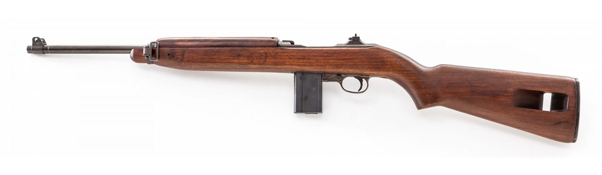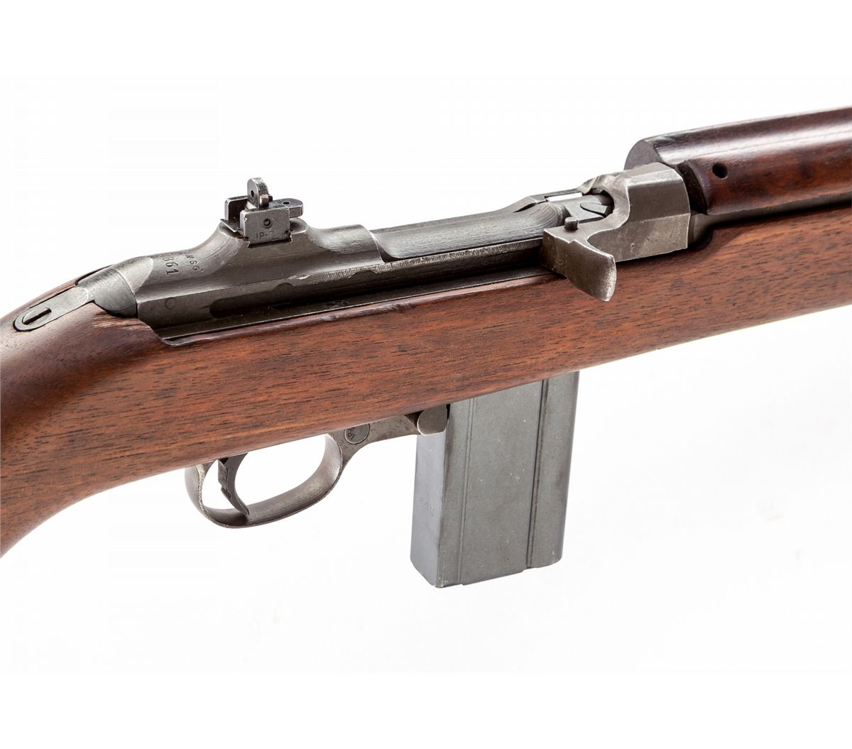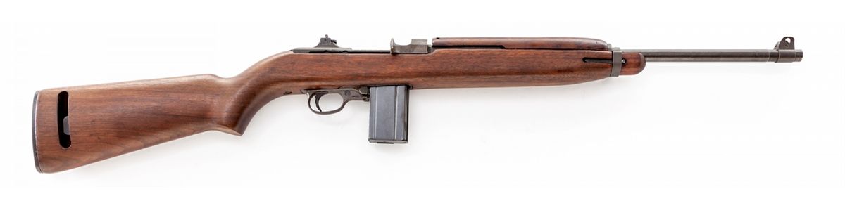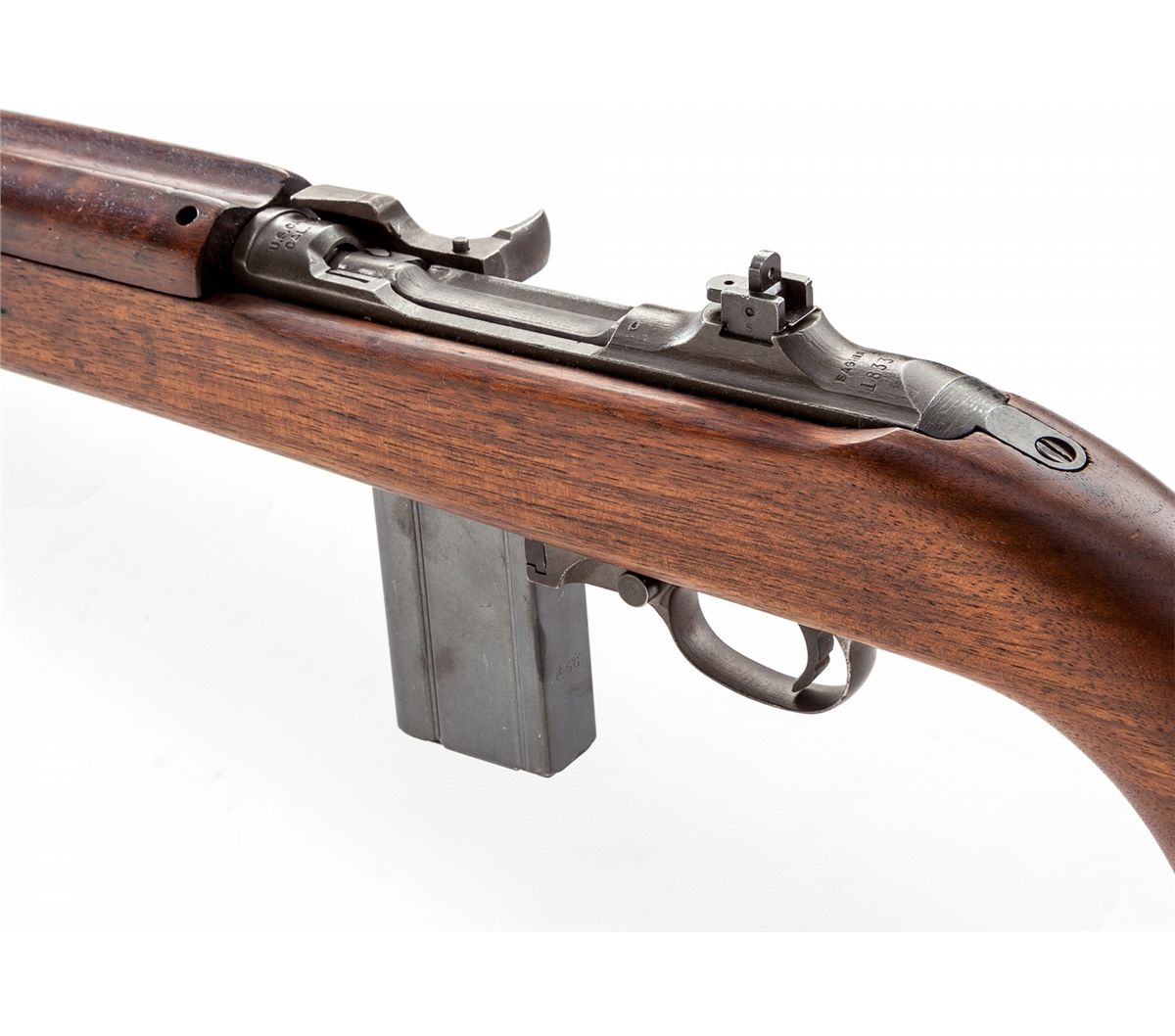 Scarce S'G' U.S. M1 Carbine, by Saginaw, #1833861, .30 Carb. cal., 18'' barrel by Inland dated 2-44, high wood walnut stock, two-rivet handguard, correct ''S'' marked flip sight, flat bolt, correct IP-W marked push-button safety, Type I barrel band, with all visible parts consistent with 1st production block Part B Saginaw S'G' production. Condition is excellent retaining approx. 96% lightly thinning parkerized finish. Stock has been lightly sanded and cartouches are not visible. Action is crisp, bore is bright. Est.: $1,800-$2,400. (C&R)