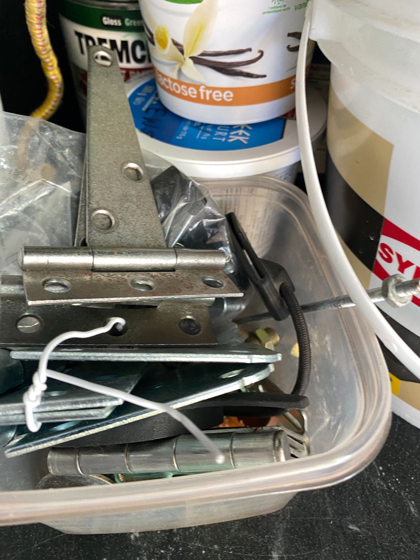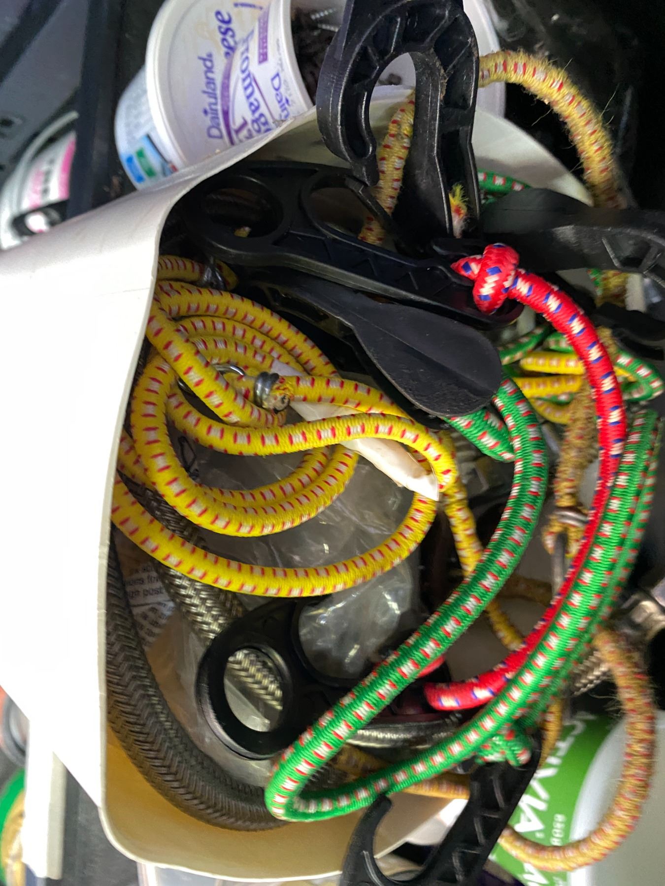 Bungee cords,flat hinges, various sizes screws,more pick up 9-10